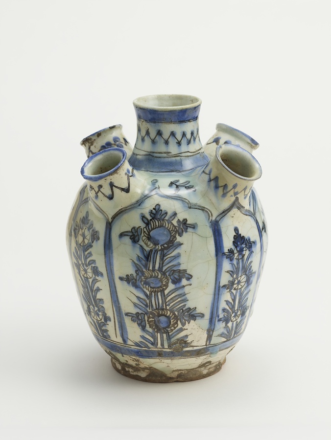 5個の注口部を持つ花瓶。撫で肩の壺の注口部を中心に、肩部の高さに、少し小ぶりの注口部4個が取り付けられている。内面のみならず、高台内面に至るまで、胴体下部の一部を除き、全面にわたって白釉を施している。高台付近の釉は一部剥落している。コバルト絵具で花卉文を胴部全面に描き、その上から透明釉を施す藍彩釉の技法を用いている。白釉が乾燥した後、焼成前にコバルト絵具で文様を描いたため、文様が滲んだものと思われる。花卉文は中国風であるため、中国景徳鎮の窯を中心とする、コバルト絵具を用いた青花(染付)磁器への憧れを反映するものであろう。