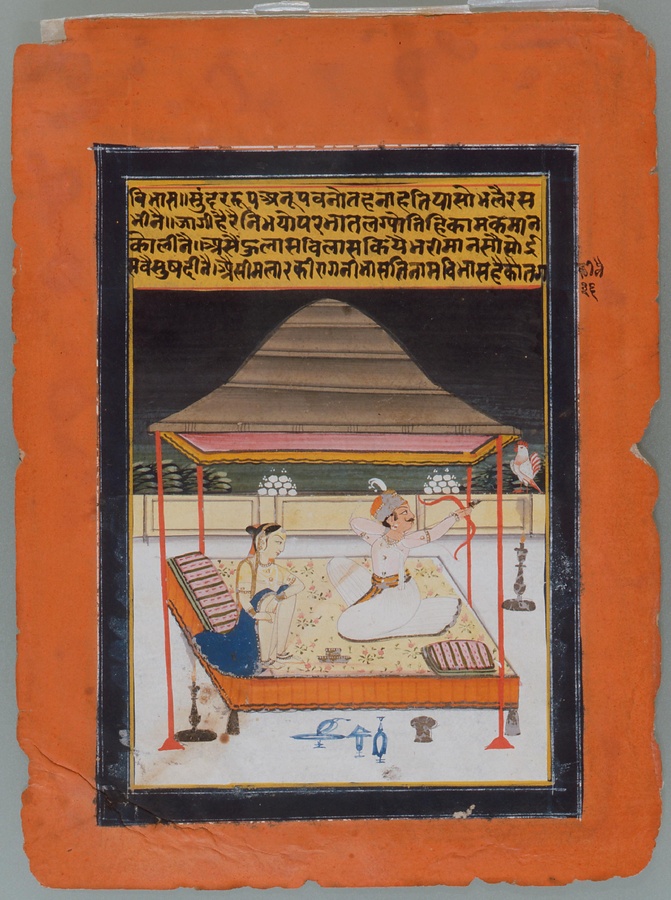 これはインドの伝統的な歌曲(かきょく)を絵画として表現したもので、楽曲絵、すなわちラーガマーラといいます。ラーガマーラはインド細密画における独自のジャンルを形成しました。
