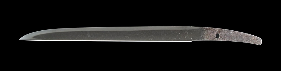 短刀は、刃わたりが約30センチ未満の刀剣で、主に太刀などの長い刀剣とともに身に着けました。反りがほとんどなく、全体的にすっきりとした形状になっているのは、鎌倉時代の短刀の特徴です。この作品は、鎌倉時代の終わりに神奈川県に居住していた行光という刀工によって作られ、江戸時代には現在の石川県を治めていた前田家に伝来しました。黒味を帯びた部分にあらわれる、木材の年輪に似た地鉄(じがね)と呼ばれる肌模様は、大きく不定形の模様が全体に広がって荒々しさを感じさせ存在感があります。黒く見える地鉄の部分と白い刃の境目で輝く刃文(はもん)は直線的で、よくみると星のように輝く粒が目立っています。この粒は「沸(にえ)」と呼ばれ、沸の目立った刃文は、行光や、師の国光、また同系列の正宗などにみられます。この短刀の刃文は高低差がほとんどなく一見地味に見えますが、沸の強い輝きが印象的で力強さを感じさせます。