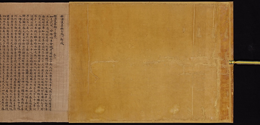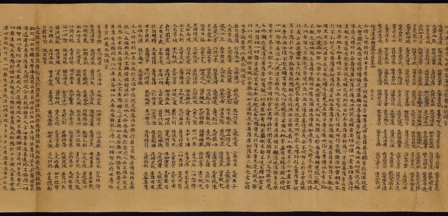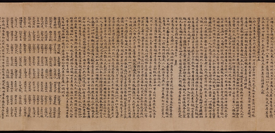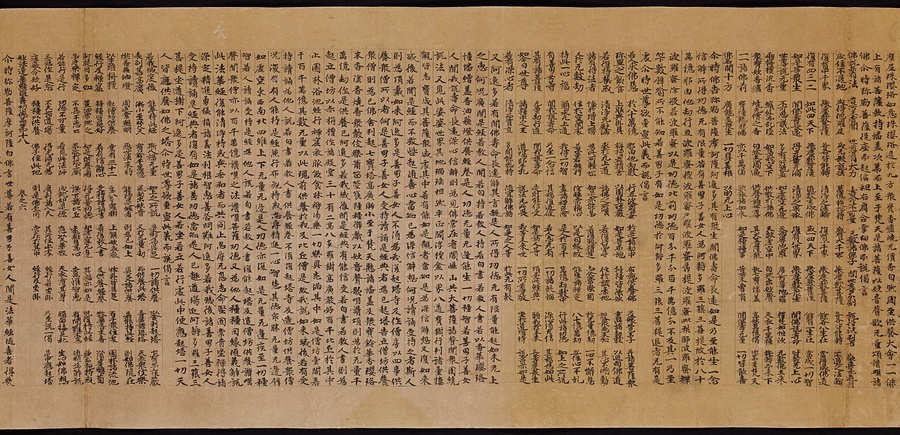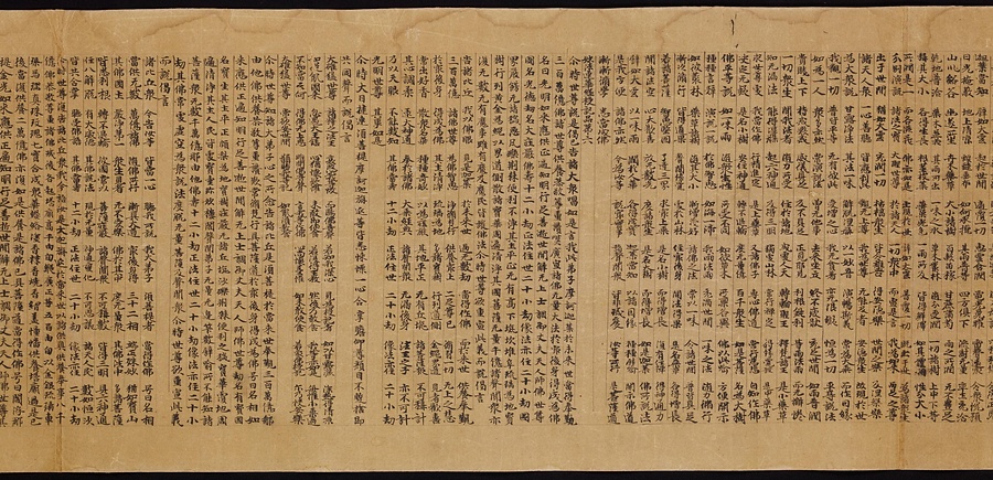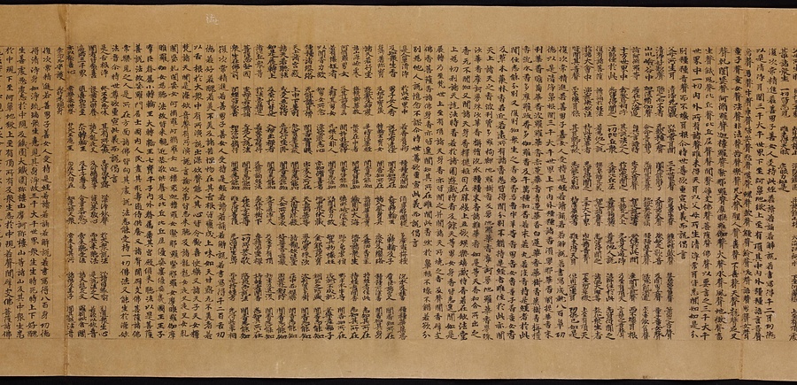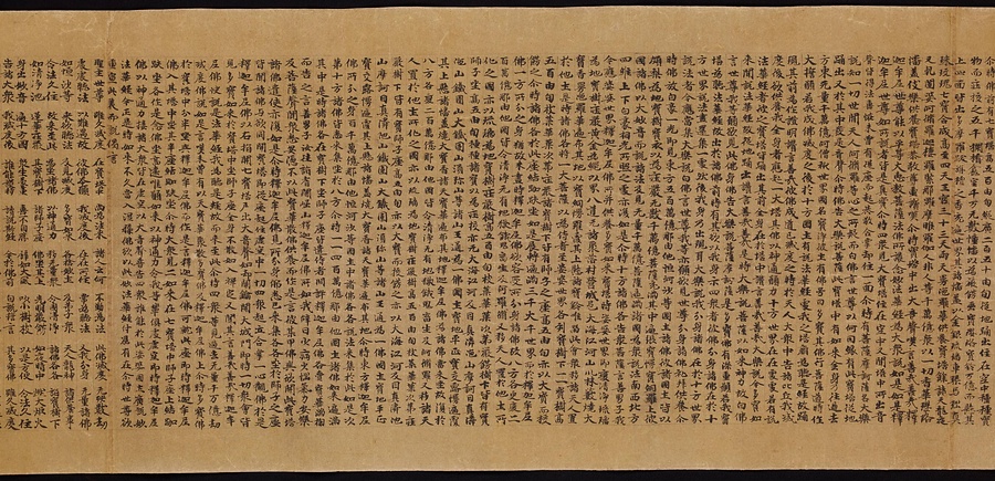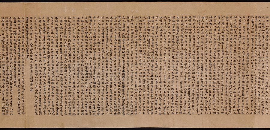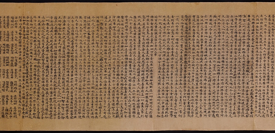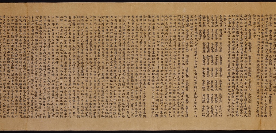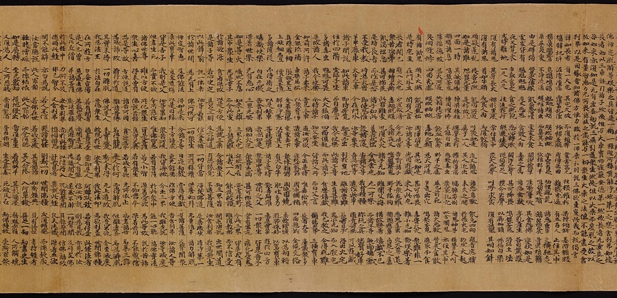 この作品は法華経全巻を1巻の巻物に書き写したもので、そのため1行に32文字がとても小さく記されています。麻の繊維をすいた紙を39枚継いだ巻物で、その長さは約19メートルに及びます。