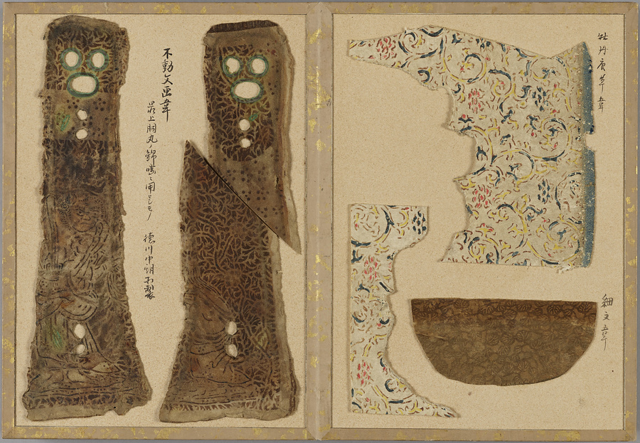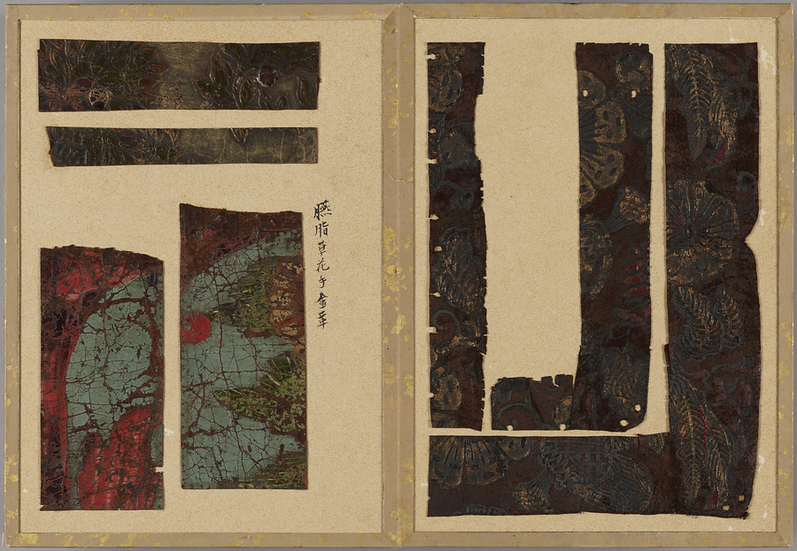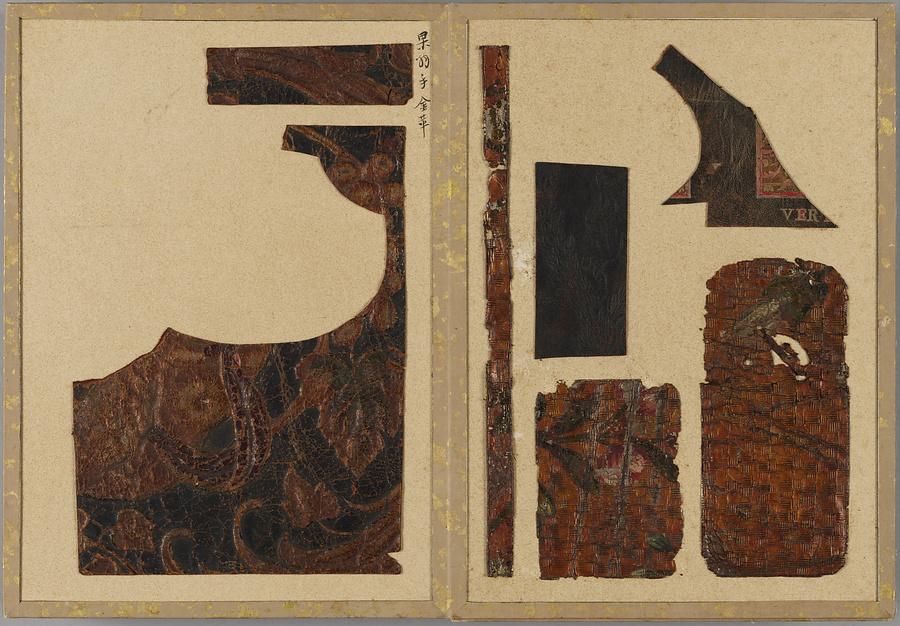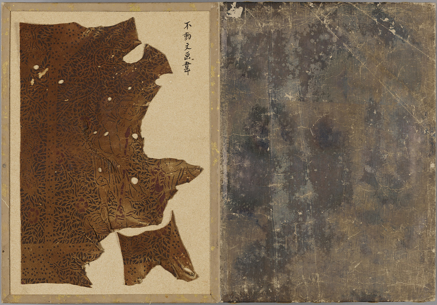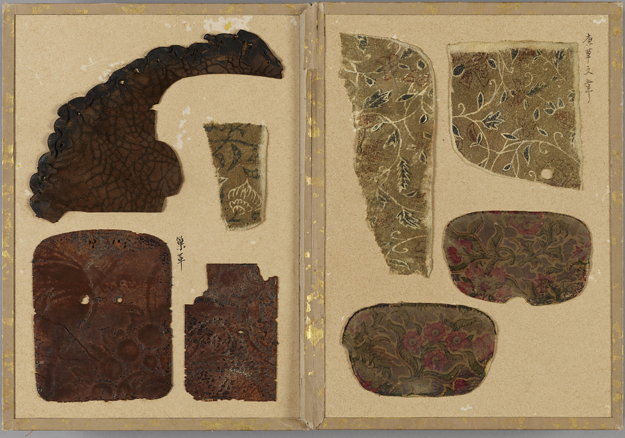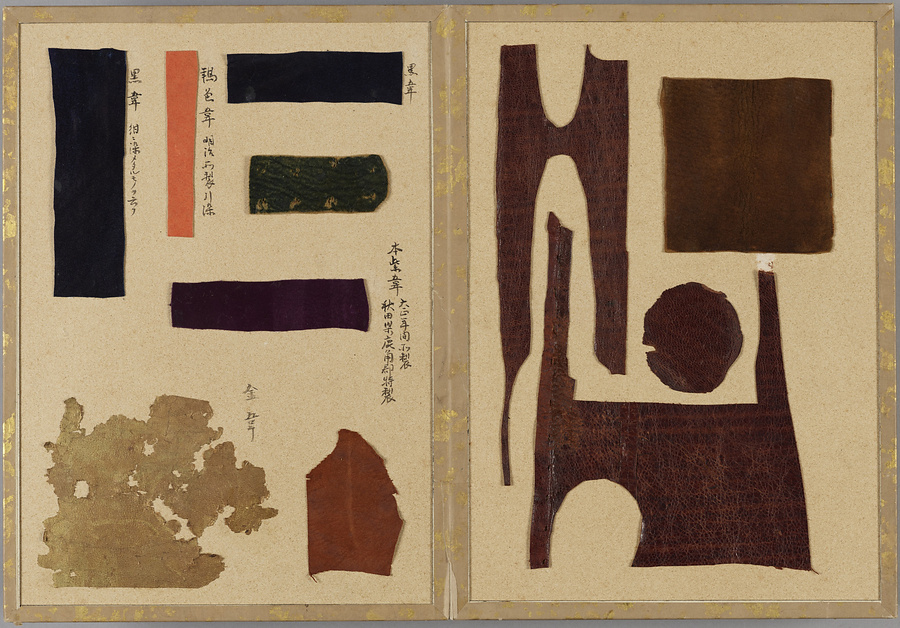 染韋裂のみを集めた珍しい折本仕立の裂帖。技法や模様の異なる様々な種類の染韋が貼り込まれている。各革片の右肩にはそれぞれの名称が記されるほか、いくつかは伝来や技法、職人についても記載があり、革工芸史研究の上でも貴重な資料である。所収の染韋裂には、煙草入れや煙管入れ、紙入れ、仕覆に用いられたと思われるものの他、天平革と呼ばれる江戸期の画韋をはじめとした甲冑用の染韋、更紗の模様を写した更紗革、舶来の金唐革などが含まれる。蝦蟇口などに成形されていたと思われる和製の印伝や合成染料で染められた明治期大正期の染韋など新しい技法によるものも含まれており、近世・近代の染韋文化の多様さをうかがい知ることができる手鑑である。