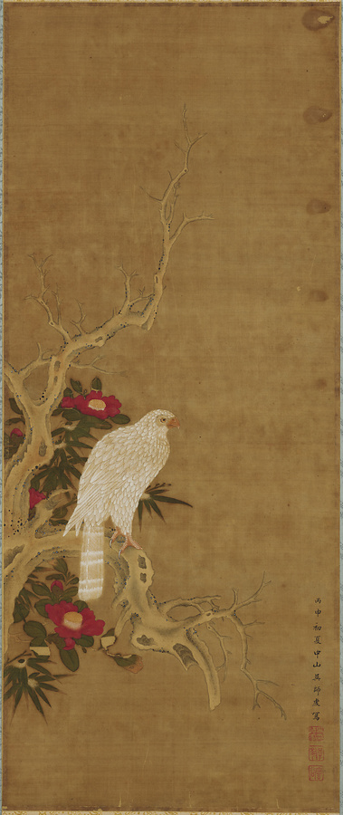 枯木にとまる白鷹の背後に、椿と雪持ちの笹を描く。その表現は、白鷹の眼や瞼の輪郭に金泥かと思われる絵具を用い、脚の凹凸を盛り上げて彩色するなど細やかな描写をもつ。その作者は、枯木の描法や形態、余白を生かす構成、落款印章などから、琉球の画家絵師・山口宗季(呉師虔、1672-1743)と考えられる。山口宗季は琉球王府の貝摺奉行所の絵師で、福州に留学して中国の花鳥画家・孫億(1638-1712-?)に学び、帰国後に絵師主取となって琉球画壇を代表する絵師として活躍した。近年新たに存在が確認された本図は、年記から彼が福州留学を終えて帰国してから9年後の制作と分かる。現存作品が極めて少ない山口宗季の画風展開を理解するうえで貴重な作品である。