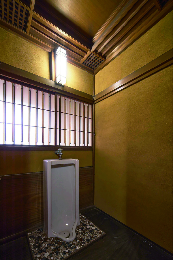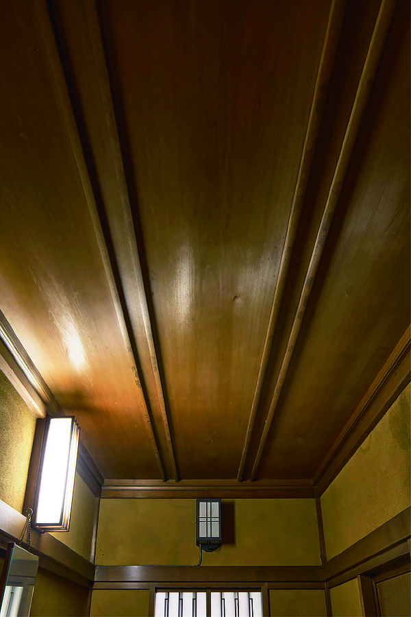 書院奥に設けられた便所の天井意匠。全体を折上風に見せる構成とし、木製の框や板材を巧みに組み合わせている。四隅には格子状の意匠による通気口が設けられ、機能性と装飾性を両立させている。