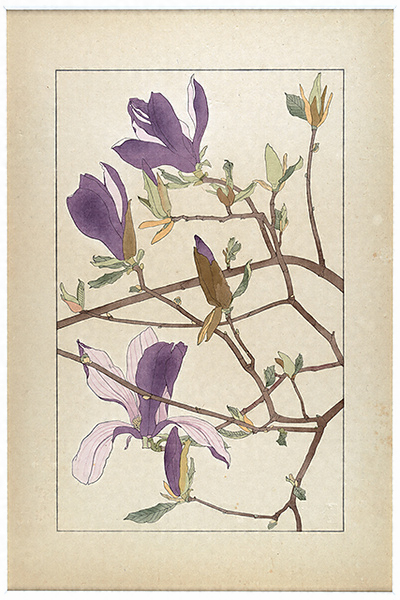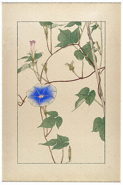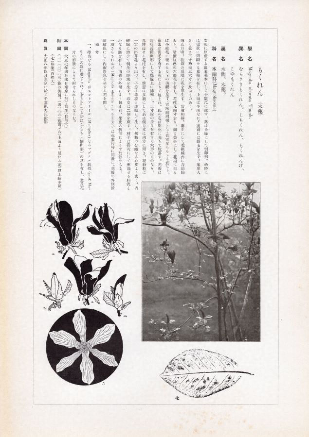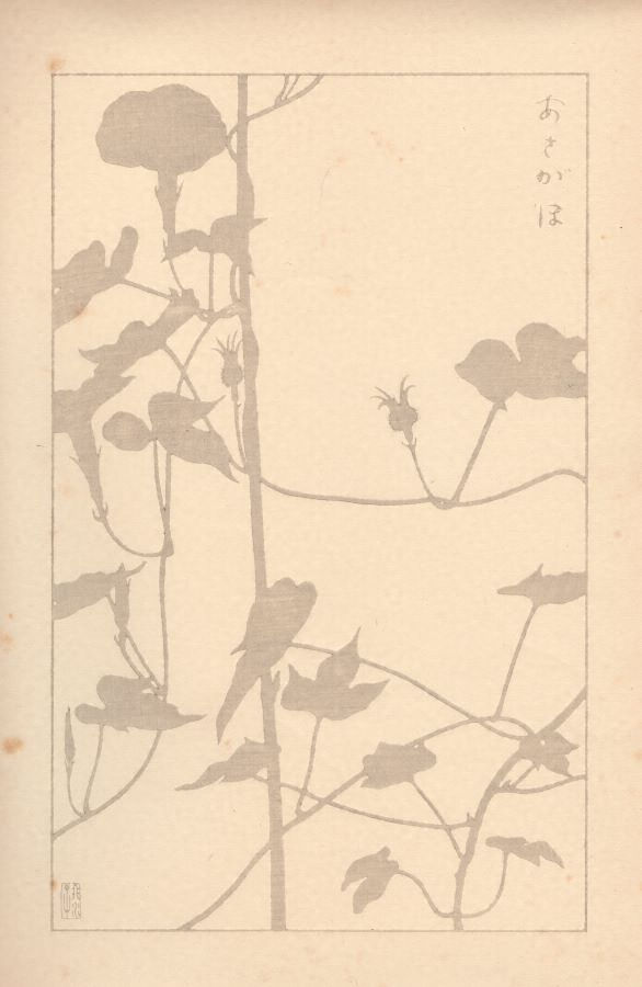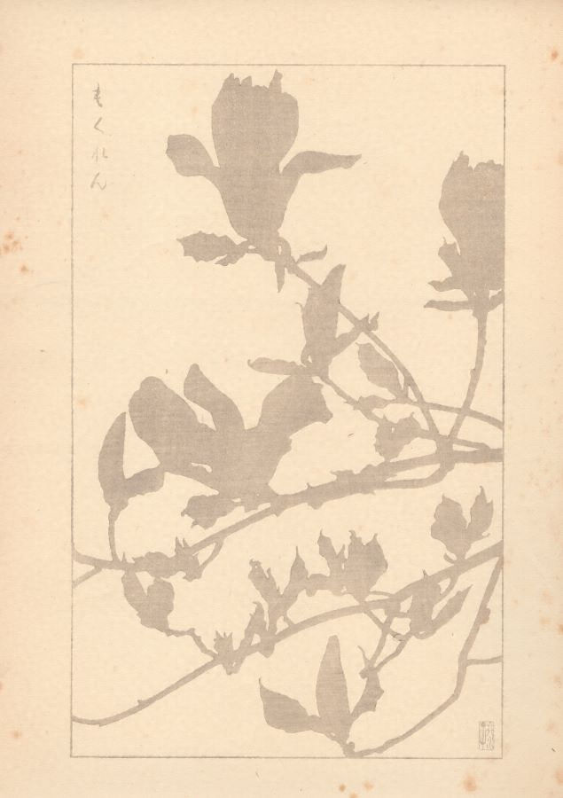 杉浦非水が原画を担当し、当時の一流の版画家が多色摺木版画として仕立てた図案集。それぞれの図にはさらに鼠色一色摺の「投影写生図」と、非水自身が撮影した実物の写真図版と植物学的解説が付属した3点1組からなる。なお関東大震災で版木は消失してしまったが、非水の手元に残されていた原画から再び版をおこし、昭和4年から同9年にかけて再版本が刊行された(初版とはモチーフの異動が若干ある)。本図はその再版本である。