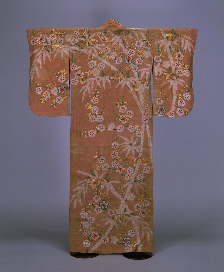 竹の立木を弧を描くように鹿の子絞りで表し、梅花を白く染め残し刺繍(ししゅう)で色を添えた麻の単(ひとえ)仕立の帷子。吉祥模様の振袖は若い女性の晴れ着であろう。袖丈は約60cmと江戸時代中期の形状をとどめる。江戸時代後期には袖丈1mあまりの大振袖が流行した。