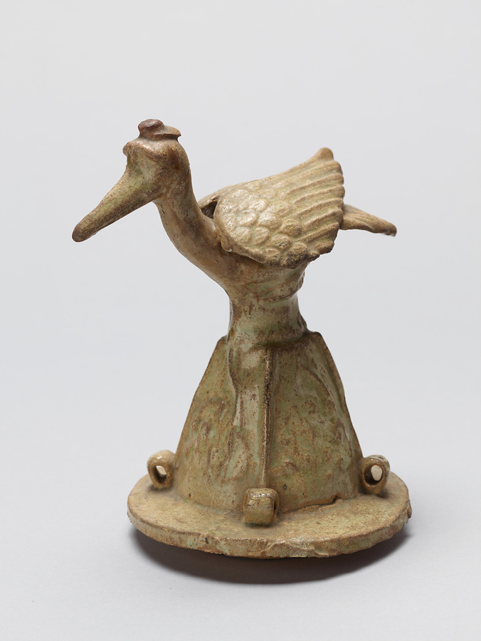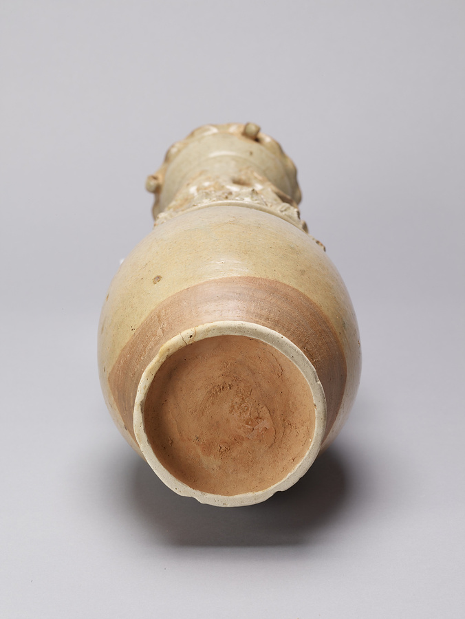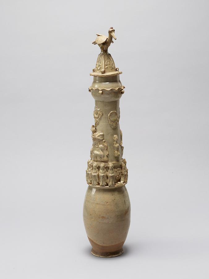 日月壺とは南宋から元時代にかけて中国江西省で流行した細長い白磁の壺であり、墓への副葬ないし葬送儀礼のために作られた。日月壺は龍文と太陽文をもつもの、および虎文と月文をもつものとで対をなす。前者の例に該当する本作品はもともと一対であった日月壺のうちのひとつである。龍文と太陽文のほか、器身の中位に廻らされた立ち姿の人物像12体と伏臥する人物像1体、蓋の頂部にある鳥形の装飾などからは、南宋から元時代にかけて江西省で流行した地域色の濃厚な道教との関連が窺い知れる。南宋から元時代にかけての中国南部各地で成立・展開した多様な葬送儀礼の一様相を示す好例である。