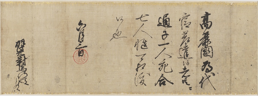 本作品は天正20年(1592)、宗義智(1568~1615)に宛てて出された豊臣秀吉(1537~98)の朱印状。6月3日付。朝鮮に派遣される代官7人に通訳を1人ずつ帯同させることを命じる内容である。「文禄の役」において、漢城(ソウル)陥落後、秀吉の朝鮮統治の方針を示すものである。本朱印状は、義智に宛てられたことから、宗家に伝来したと考えられるが、研究史上、原文書の所在は不明とされてきた。明治時代の史料集に掲載されており、書写されたことは分かっていたが、その後散逸したと見られ、長らく所在が不明であった。編纂史料でのみ存在が知られていた重要史料の原文書として、本朱印状は非常に価値が高い。