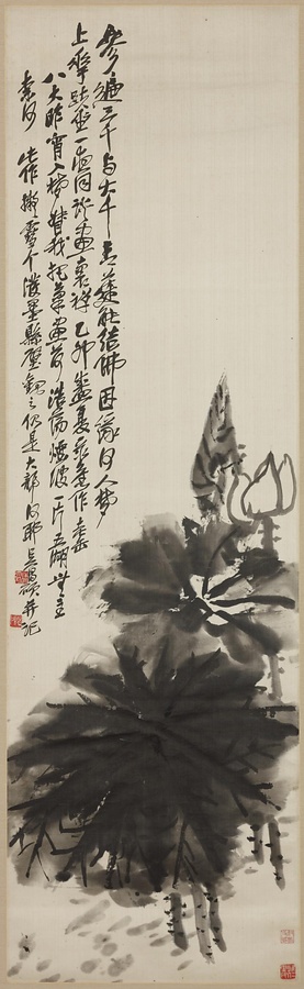 呉昌碩は一時期、明末清初の朱耷(しゅとう)(八大山人)の画に深い感銘を受け、懸命に模倣しました。この作はある晩、八大山人が画を教えてくれる夢を見た呉昌碩が、翌日、一気呵(いっきか)成(せい)に描きあげた荷花図です。八大山人の墨の使い方を真似ながら、呉昌碩の個性も表出された72歳の優品。