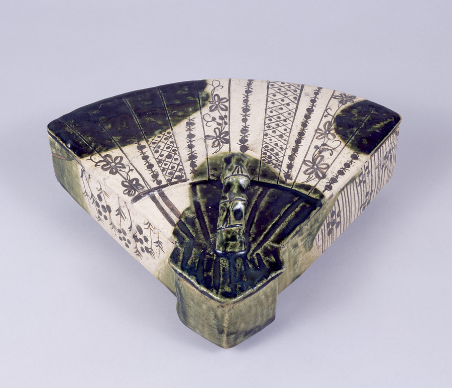 織部は志野とともに桃山を代表する焼物である。志野が美濃で天正・文禄ごろに優れた製品を焼造したのに対して、織部は慶長・元和ごろにつくられた。この扇形の蓋物は織部の典型的な作品の1つである。ふた表に箆(へら)目で扇の骨と地紙を表わし、骨の中央に力強い根竹のつまみを張り付け、身にも箆彫りの扇骨を表わしている。蓋には3方に、身には2方に織部独得の美しい緑釉をほどこし、白地の部分には、石畳や縞、網、梅唐草、連珠文風なものなどを組み合わせて銹(さび)絵で描いている。桃山時代に作られた本格的な食器の1つであり、時代の好みを端的に示した作品である。底は1部が露胎であり、3方にちいさな脚を貼り付けている。