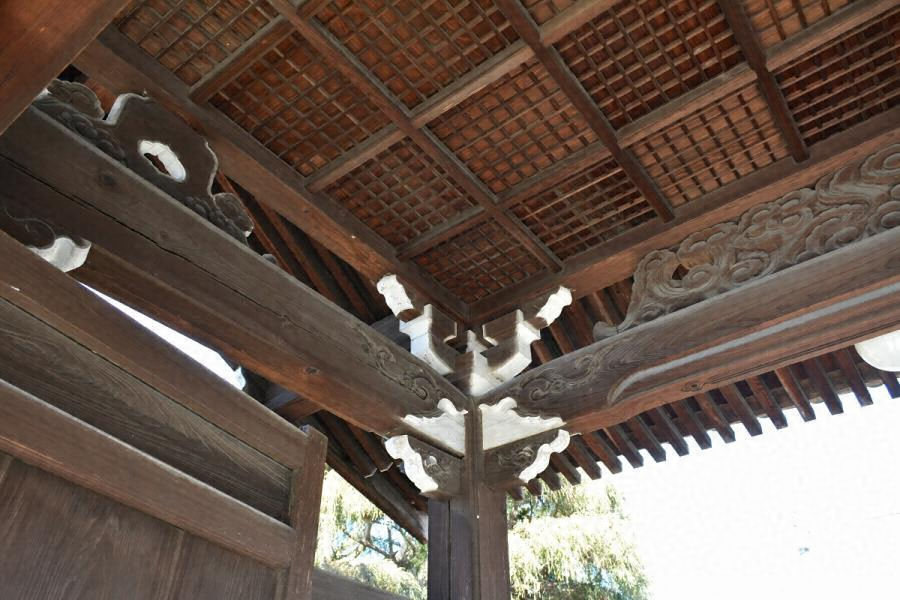 浄土真宗寺院の境内南正面に開く山門。切妻造桟瓦葺、二軒繁垂木の薬医門で、袖塀に潜りを設ける。正面蟇股は精緻な龍を彫り、内部に小組格天井を張る。鐘楼棟梁の弟子の作で、地元大工の仕事ぶりを伝え、百々ケ峰を背にして地域の歴史的景観を形成する。