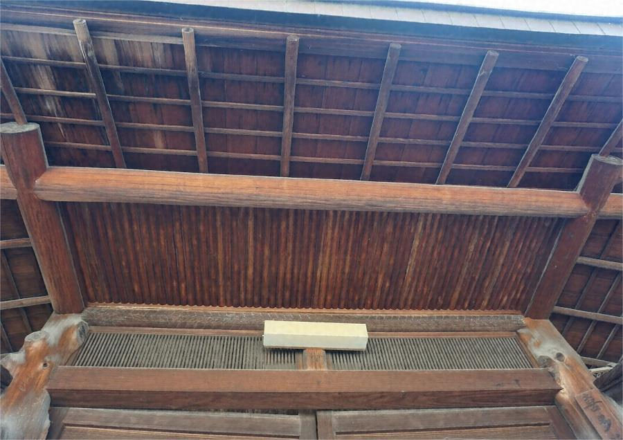 初瀬街道に面して建つ薬医門。間口二・六メートルで左右に袖塀が付属する。本柱、控柱とも節を出した丸太材を用いて腕木を受け軒桁を渡す。屋根は入母屋造桟瓦葺一部銅板葺。軒天井は小丸太を敷並べた瀟洒な意匠。街道沿いにもと料亭旅館の表構えをつくる。