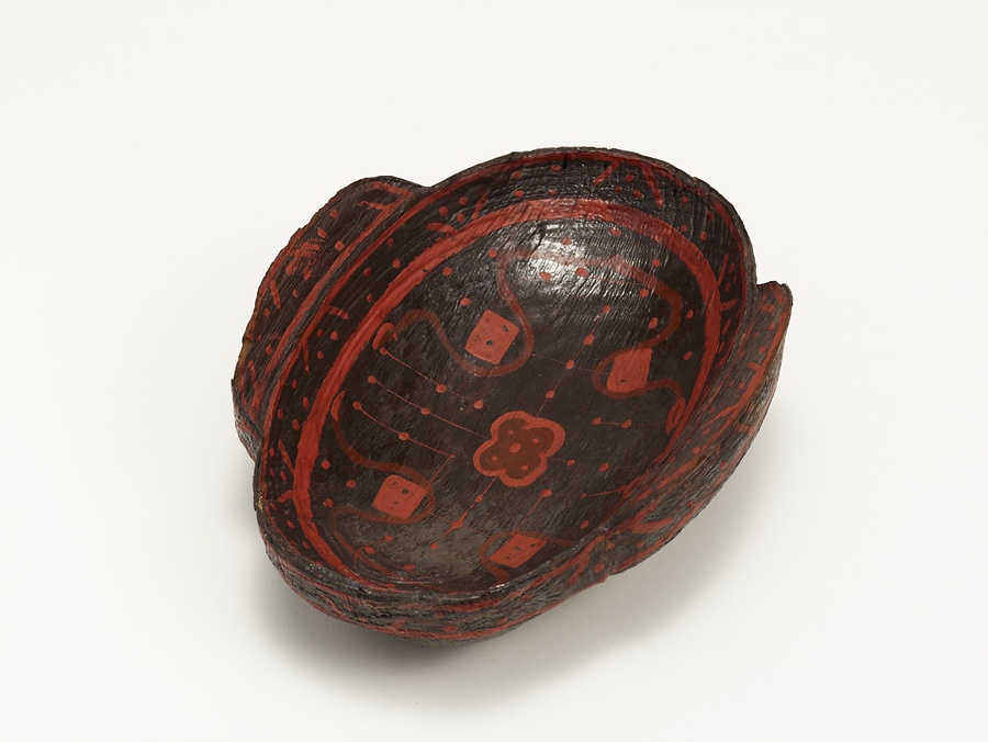 平面が楕円形の木胎漆器で、長手の両側に把手が内傾してつく。俯瞰すると把手がひとの顔の両耳に見えることから、「耳杯」と呼ばれる。全体に黒漆を塗り地となし、朱漆と褐色に近い朱漆で四葉文・V字文・列点文などを描く。耳杯は羹や酒を盛る容器として戦国時代(紀元前5-前3世紀)に登場し、秦漢時代(前3-2世紀)に盛んに作られた。青銅器、銀器、玉器、ガラス器、陶器(副葬用の明器)などでも作られたが、本来は漆器で実用に供された。本作のように把手の輪郭が弧状を呈し、内外の口縁部をV字文と点で飾る耳杯は湖北省雲夢などの秦漢墓から多数出土している。秦から前漢時代の前期(紀元前3-前2世紀)にかけて製作された耳杯の典型例として位置づけられる。