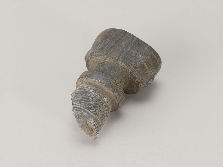 彫刻文様のある石棒頭部。粘板岩製で、部分的に摩滅しているが、細かな刻みを施した窓枠状の区画文、直下には鍔(突帯)、その下に2条の沈線もみられる。鍔には横位の沈線をめぐらし、矢羽根状に細かな刻みを施す。胴部が欠損しているため詳細不明であるが、両頭石棒の可能性あり。1号住居址出土。