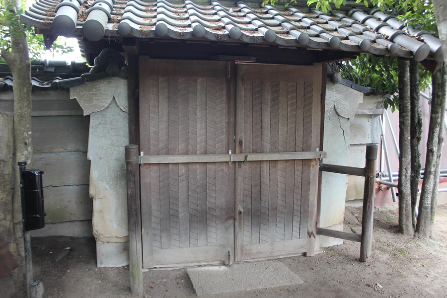 敷地西辺の南端部に位置し、通りに西面して建つ通用門。石段上に建つ、切妻造平入桟瓦葺の腕木門で、背面両側に控柱を立てて貫で固める。門口に吊る両開きの板戸は、両面をなぐり仕上とした丁寧なつくり。簡素ながらも瀟洒な外観で敷地西辺の景観をつくる門。