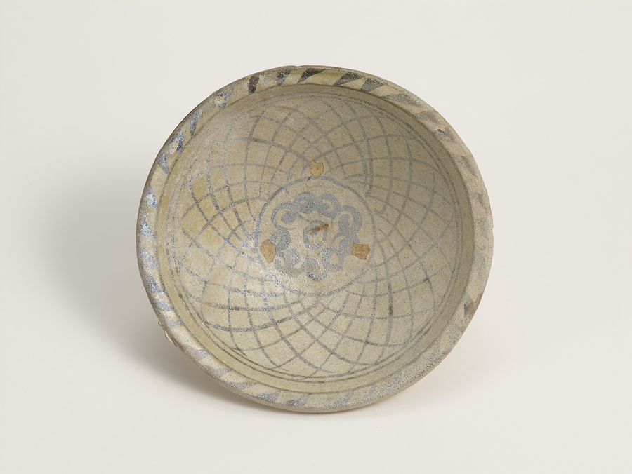 薄い茶褐色の胎土を用いた、高台から緩やかな曲線を描いて広がる、口縁部が少し厚手の鉢。高台内部まで全面的に白化粧土を掛けている。見込み中央に花文、内面に網目文、口縁部には線状文を灰色の絵具で描いている。内面にのみ透明釉が施されている。見込みには焼成時のトチン痕3箇所がある。内面と口縁部の一部に釉の剥がれが認められる。口縁の外面に一部釉薬が垂れている。高台の内部は緩やかな弧を描きながら窪んでいる。