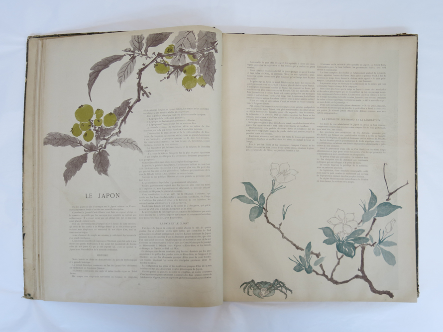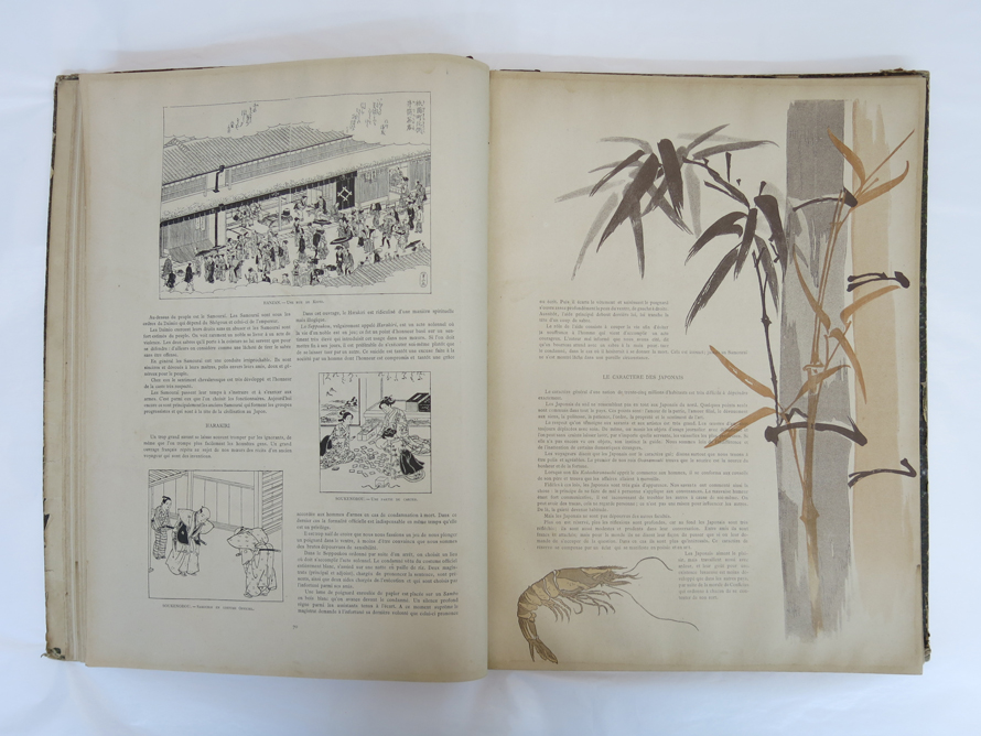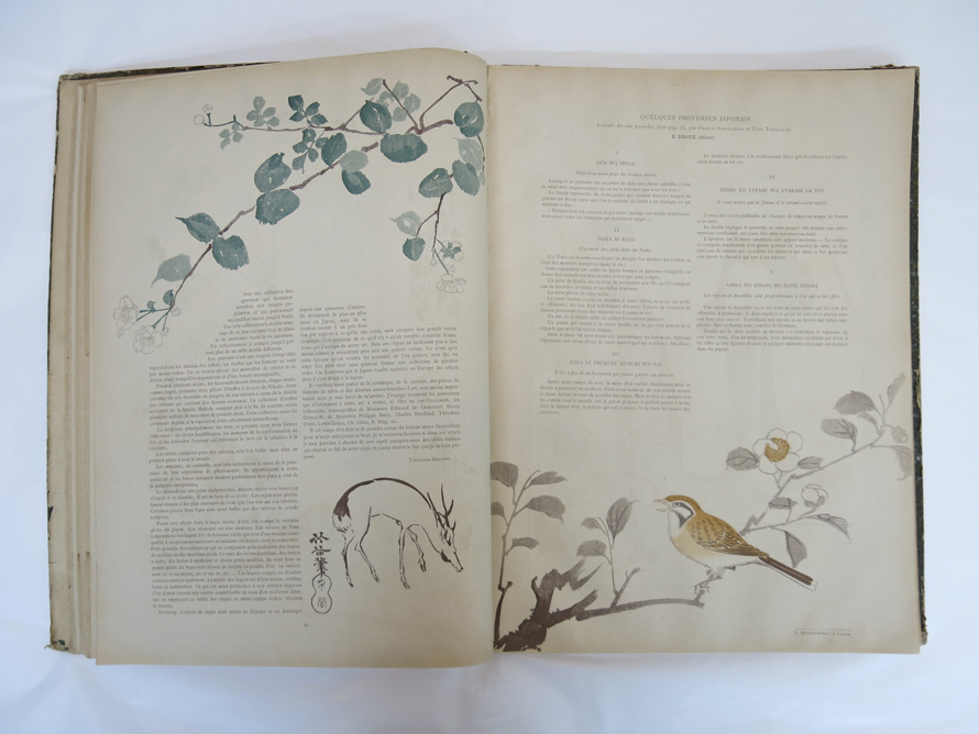 第45・46合併号は「日本特集号」(1886年5月/24頁)で、日本文化や習慣などを、高岡出身で当時パリで美術商として活躍していた林忠正が紹介した。本来は渓斎英泉の「雲龍打掛の花魁」が配されたカバーが掛けられているが、本資料は合本のため付属していない。なお、忠正が弟・長崎千里に送った「日本特集号」(個人蔵)の表紙カバーの墨書には、全文フランス語の本文執筆、および掲載した錦絵の選別などの編集レイアウトも忠正が行い、25,000部を印刷し完売したとある。