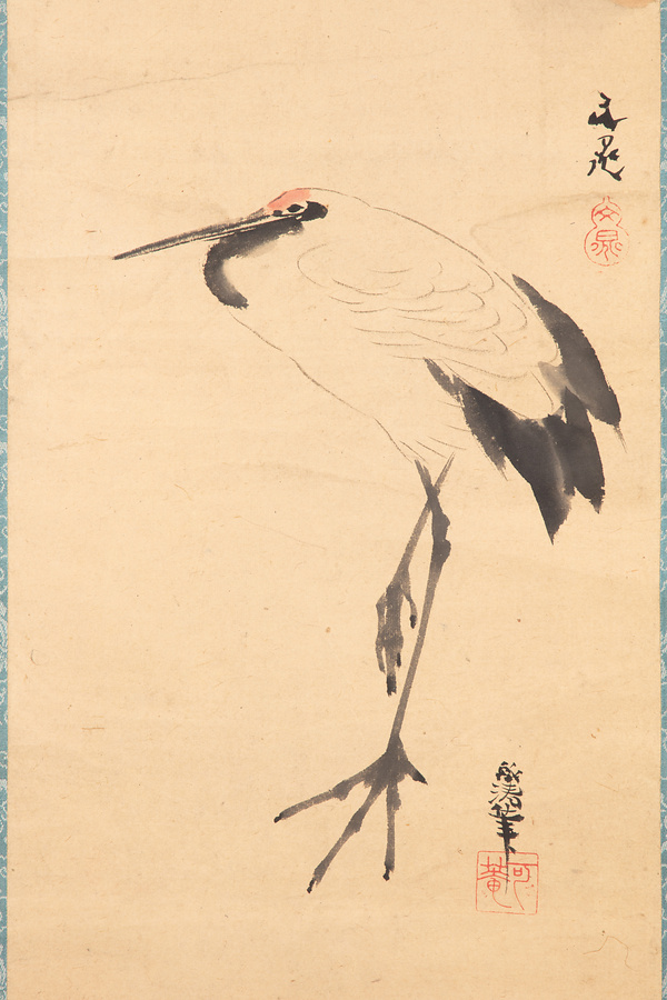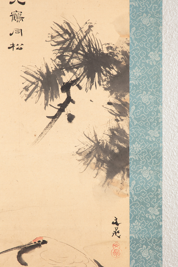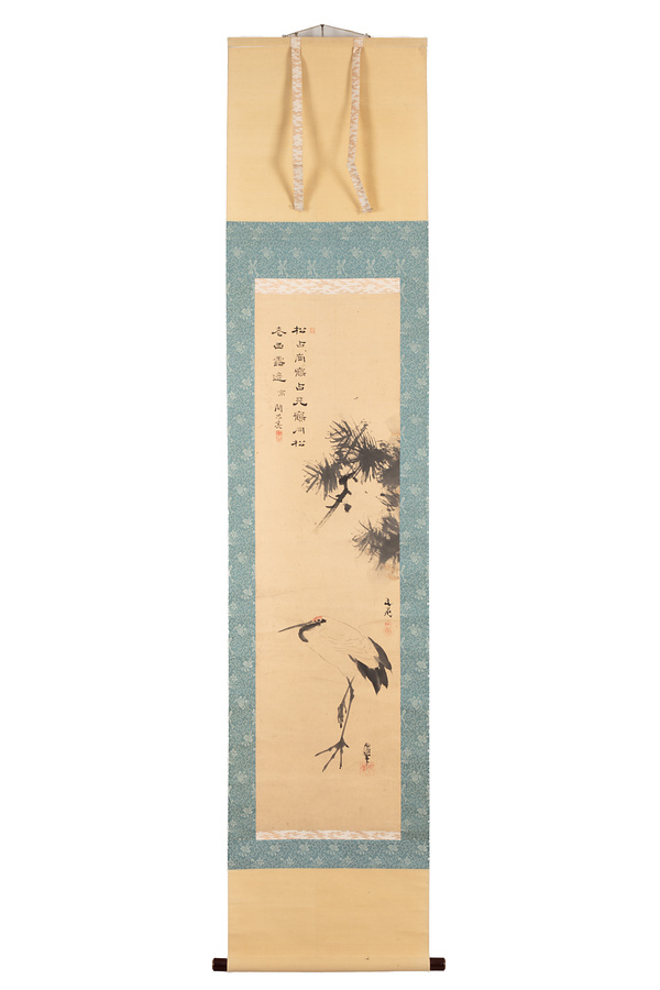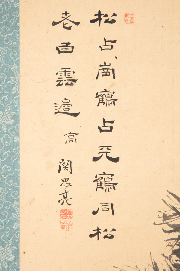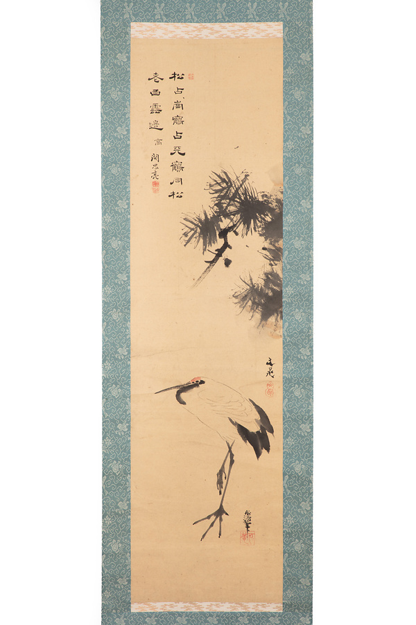 本作品は、谷文晁が松、喜多武清が鶴、関思亮が七言二行をしたためた合作。関思亮は、書を持って土屋家に仕えた関家の3代目克明の実子だが、4代目を継がず29歳で逝去。克明・思亮父子は、谷文晁や滝沢馬琴ら、江戸の文人らと交遊したことで知られている。