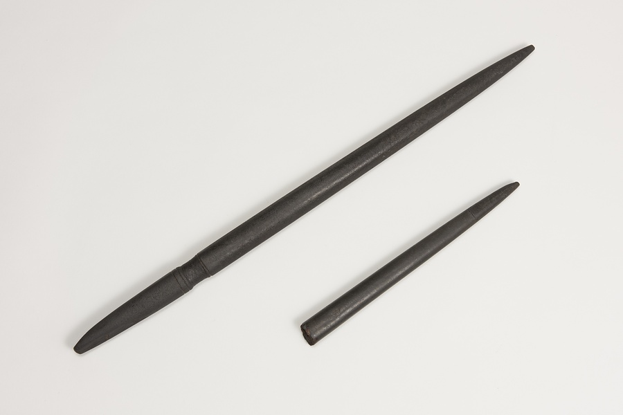 縄文時代晩期の東北を中心に分布する石剣。左の1は完存、右の2は先端側3分の1程度が残る。剣状で、沈線と敲打で表現された区が特徴的である。全面に漆状の黒色物質が薄っすら付着している。縄文時代の石棒類は、その起源を先行する骨刀類に求める見解が多いものの、中国東北部やシベリアで出土する青銅製刀子・短剣に求める見解もあり、今後の研究が注目される石器である。箱書は「霹歴碪」、「越後蒲原郡古鷹ノ里/武埴姓都知多庫(朱文方印)「塡」」。