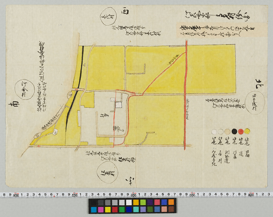 河内国丹北郡高見村の絵図で、絵図名は記されていない。貼り紙には、宝暦10年(1760)の巡見に際し制作された絵図の写しと記されている。長尾街道は「泉州堺より和州道」と表記されている。村内の個々の建物は描かれていないが、高札場のみ高札と囲いが描かれている。