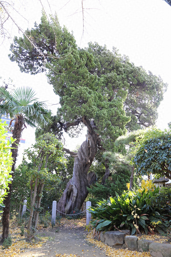 ヒノキ科ビャクシン属の針葉樹。融通念佛宗寺院である来迎寺(丹南本山来迎寺)の境内にある。樹齢は500年以上で、樹高15m、直径1.27m、幹周り4.1m、枝張り12m。昭和56年(1981)6月1日に大阪府指定天然記念物に指定されている。