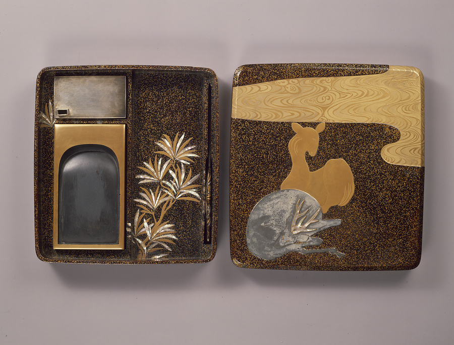 永田友治は正徳・享保頃の人とされるが未詳。「青々子と号し、大に光琳の風を慕ひ遂に其妙を得たり」と伝えられ、琳派の系譜に入る。硯箱は水辺に憩う雌雄の鹿を蒔絵、錫板、螺細で表す。内部の意匠も琳派風。友治の銘や印をもつ作品は数あるが、このような大作はほとんどなく、本作品を代表作と考えてよいだろう。江戸時代に自作を明確にしたユニークな作家の一人である。