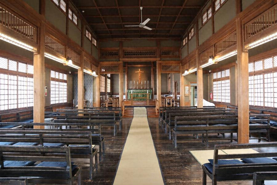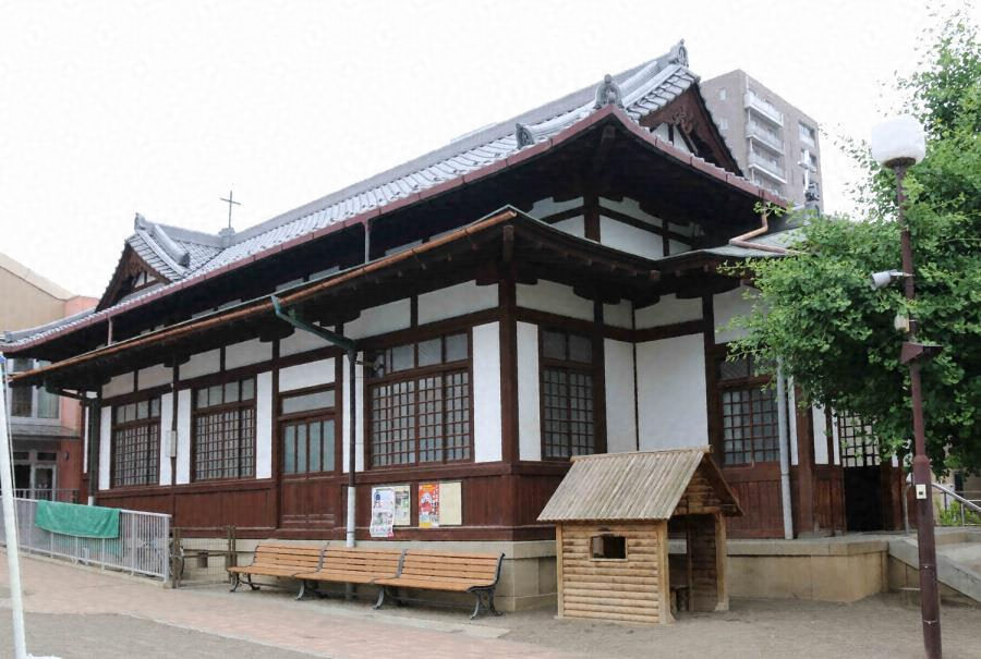 市中心部にある木造教会堂。道路に西面して建つ入母屋造妻入で、撞木造とし、四周に下屋を廻して正面に入母屋玄関を付す。内部は面取角柱を立て三廊式とし、欄間や高窓の障子、格天井などに伝統建築の要素を取り入れる。近代和風の教会堂として貴重。