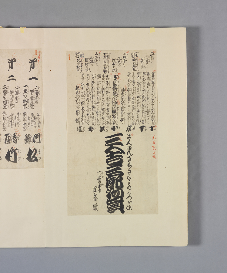 黙阿弥自筆による『島鵆月白浪』等番付の下絵、舞台上の役者の配置指示図面、『三人吉三廓初買』『小袖曾我薊色縫』他番付の語り文、舞台背景の指示などが貼りこまれている。番付の下絵は役者の表情はあえての単調ながら、細かな演出指示が表われて画才を見せる。明治14年(1881)の引退披露に際して配った、次女島女の絵の師匠・柴田是真が描いた「引ひほ」(引き汐に蟹)の榛原製摺物。喜寿に書いて配った「火の用心」や「寿」短冊、それに載せた狂歌「気の利た化物は疾引込むに/ろくろ首ほど長くのびたり」の下書き等も収める。