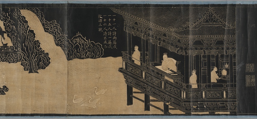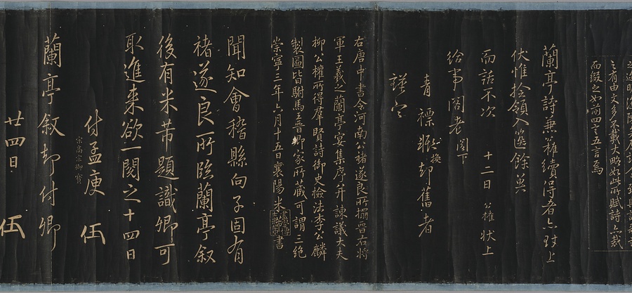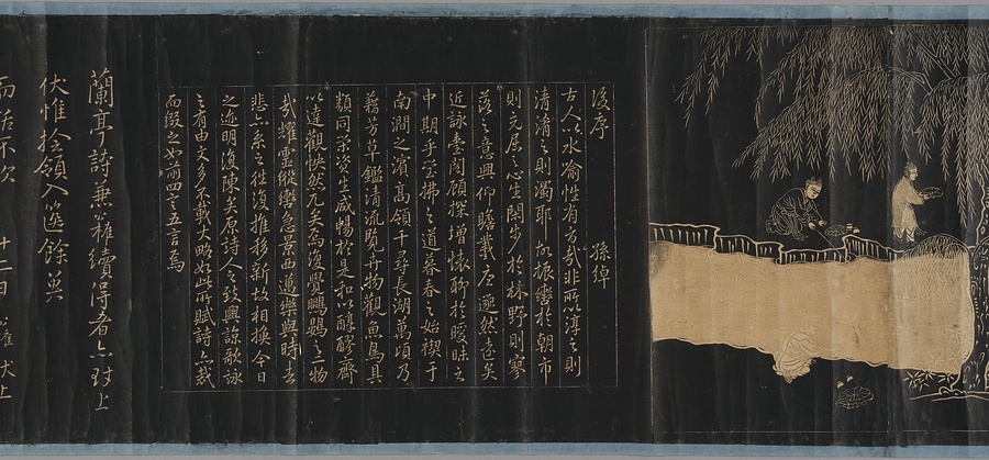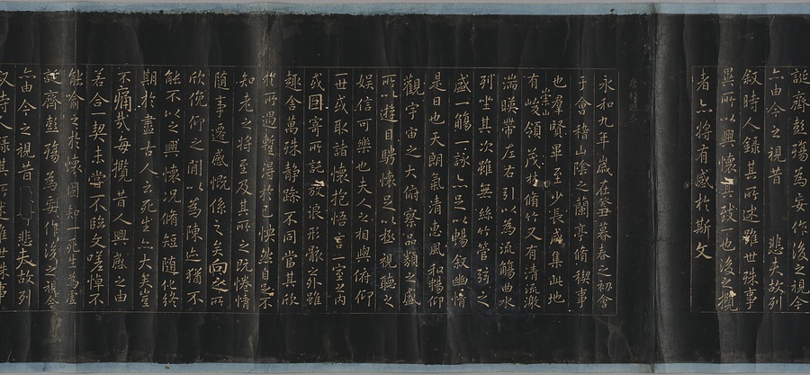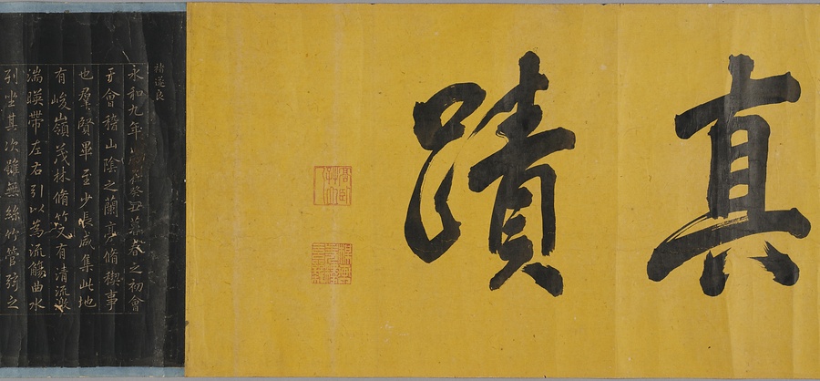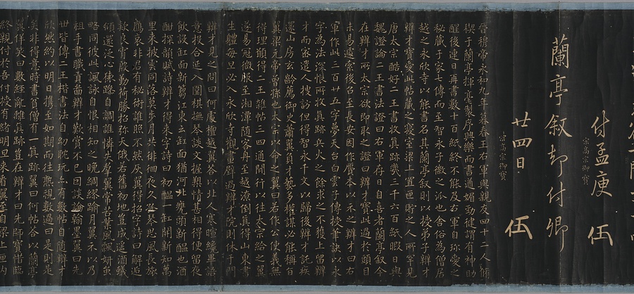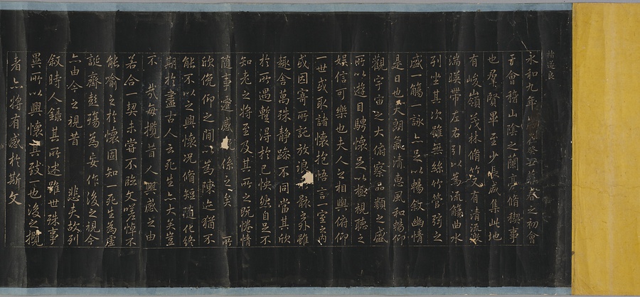 本品は明時代・永楽15年(1417)に、朱元璋(1328-1398)の孫である朱有燉(周憲王。号は全陽翁、東書堂、淩云軒、蘭雪軒、錦窠老人など。1379-1439)が刊行した「蘭亭図巻」で、永楽大本と分類される拓本である。朱有燉は永楽本の大本と小本の二種を刊行したが、刊行部数はごく少数であったため、これまで現存例は知られていなかった。