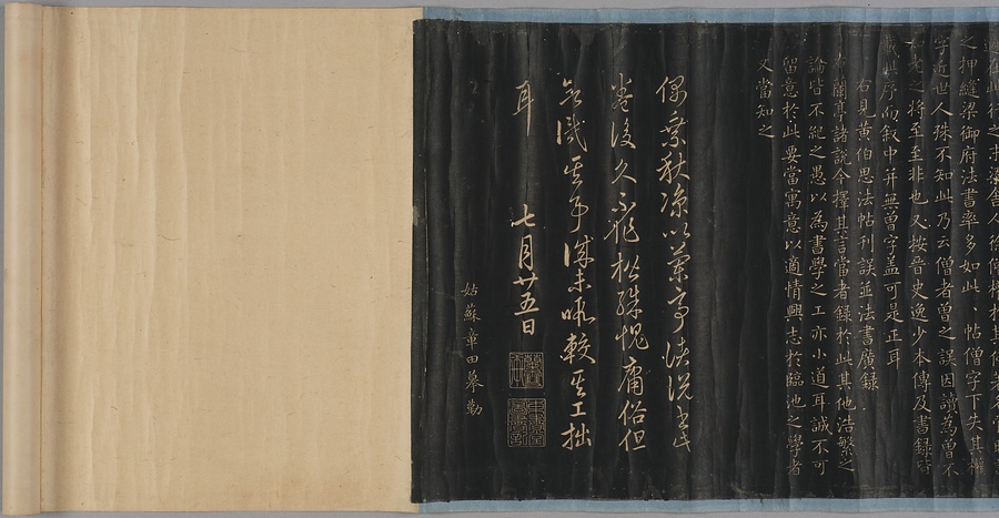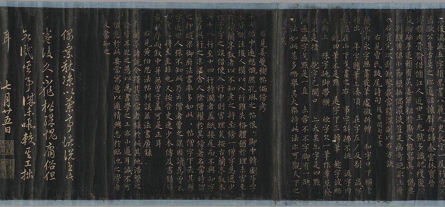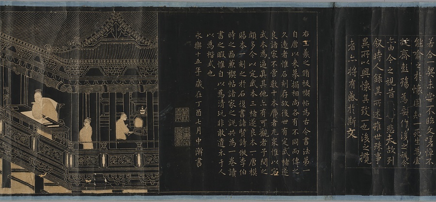 永楽本の現存例はこれまでに知られておらず、万暦本から永楽本の構成を推測するしかなかったが、本品によって、その推測が正しいことを確かめられる点で、本品の研究史上の重要性は高いといえる。ただし、本来であれば3種の定武本蘭亭序があるはずだが、本品から定武本・定武肥本・定武痩本の各蘭亭序が失われている点が惜しまれる。本品と同じ永楽大本と考えられるもので、同じく先行研究で存在を知られていなかった「明周王府東書堂重摹唐模賜本蘭亭序及図跋全巻」(中野三敏氏旧蔵)もあるが、こちらは朱有燉題辞と3種の定武本蘭亭序、褚遂良本蘭亭序が失われている。本品は永楽大本であることが確実で、また中野氏旧蔵本と比較して内容が充実していることに鑑みても、大変貴重な作例である。