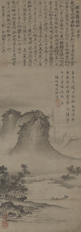 玉隠の序によれば、「在る人」から本図への題詩を依頼され、画中の景観が「造化、神秀を鍾(あつ)む」(造物主が神々しいばかりに美しい景観をあつめた)様であることをもって「鍾秀斎図」と名付けたという。この一節は中国・泰山の景を謳った杜甫の詩「望嶽」の一節にちなんでおり、玉隠は画中左手の主山に泰山の峩々たる様を想像したのであろう。一方の子明の賛には「貞吉の盧する所、山水幽なり」とあり、画面左下の茅庵の主と謳われる「貞吉」なる人物と本作の成立には何かしら関わりがあるのかもしれない。なお玉隠の賛の末尾には「永正寅之秋」の年紀があり、これは永正三年(一五〇六)または十五年(一五一八)の二通りに解せられるが、いずれにせよ現存する祥啓の山水図としては最も晩年期の作となる。