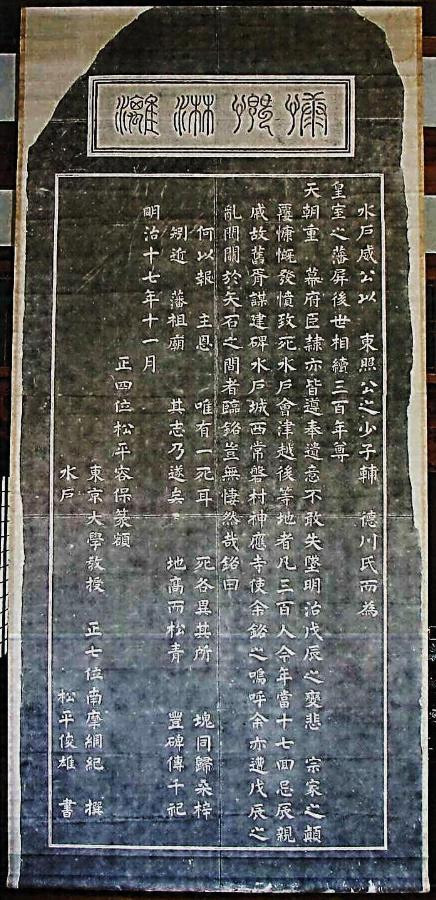 石碑は昭和20(1945)年の水戸空襲により飛散しましたが,拓本と台石が現存し,幕末・維新期に国の行く末を真剣に考え,殉難した郷土の先人たちの足跡を顕彰する上で,貴重な価値を有します。