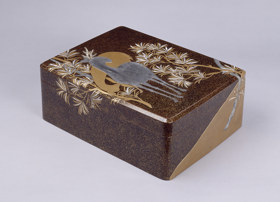 永田友治は正徳・享保頃の人とされるが未詳。「青々子と号し、大に光琳の風を慕ひ遂に其妙を得たり」と伝えられ、琳派の系譜に入る。片身替り風の土坡に槙に鹿を蒔絵、錫板、螺細で表す。内部の意匠も琳派風。友治の銘や印をもつ作品は数あるが、このような大作はほとんどなく、本作品を代表作と考えてよいだろう。江戸時代に自作を明確にしたユニークな作家の一人である。