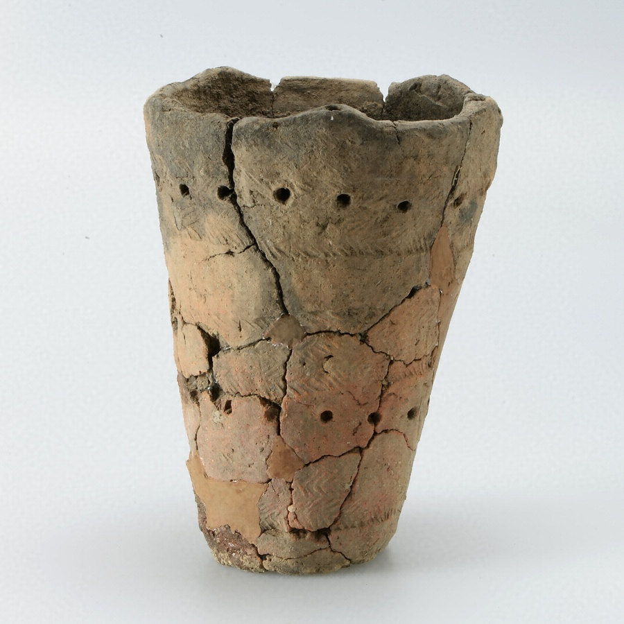 平底押型文土器は北海道東部の縄文時代前期末から中期初頭に特徴的な土器である。平底円筒形の器形は同時期の道南部に広がっていた円筒土器文化の影響とされるが、側面に彫刻した木の棒を回転させて付ける「押型文」は道東部の土器の特色である。この土器では山形のパターンが連続する押型文が施され、丸い棒の先端で付けた円形刺突文が2段めぐらされている。