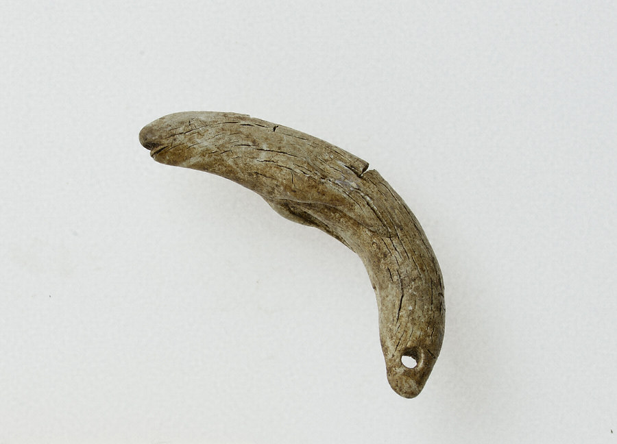オットセイを表現したものと考えられる骨製の彫刻品。頭部と前ヒレが表現されており、尾部には穴があることから垂飾だったものと考えられる。