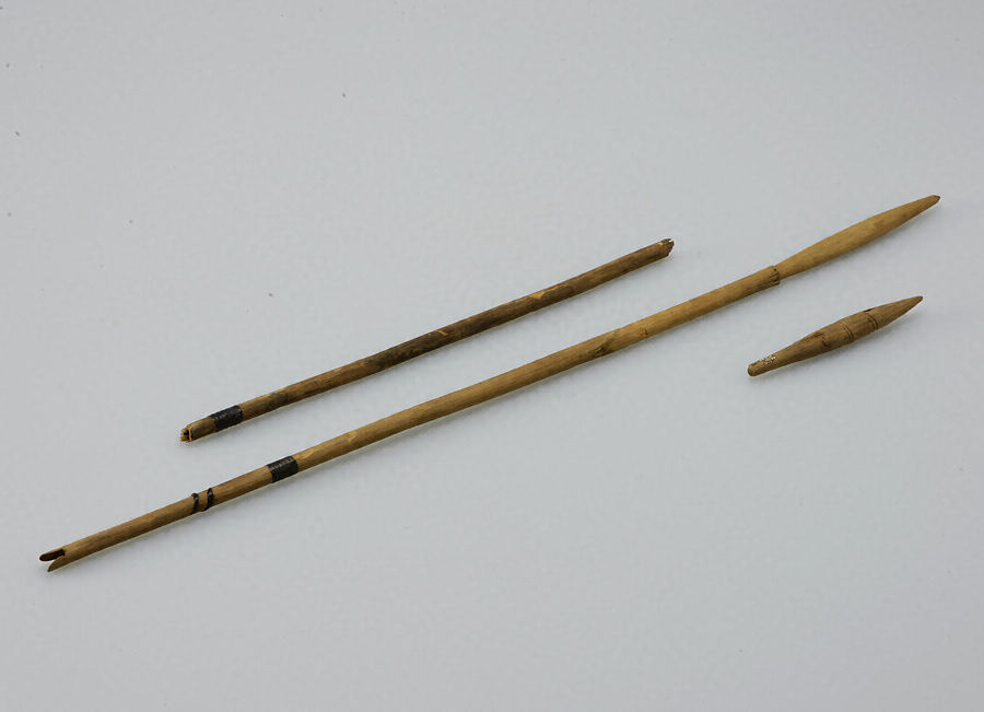 木製の鏃と矢柄。矢柄には紐状にした黒いサクラの樹皮が巻き付けられた個所がある一方で矢羽根を付けた痕跡がなく、儀礼用など遠距離に飛ばす必要のない用途であったと考えられる。