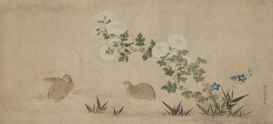 今尾景年旧蔵の作品で、もとは風炉先屏風であったという。画面は中央付近で巧妙に継がれており、掛軸への改装の際に画面が横方向に縮められたものとみられる。鶉や菊花の描写はきわめて精細で、光起の優れた画技を示す優品である。景年の子、景祥の箱書きをともなう。