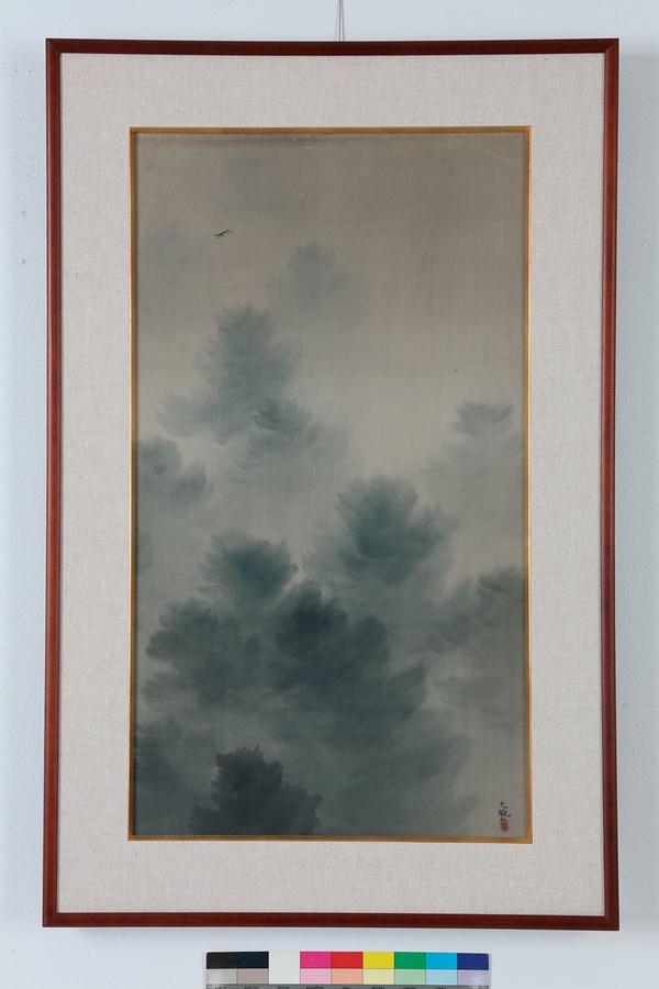 さて、画面には初夏を告げる杜鵑が上空を横切り、奥深い空間を感じさせる樹木が濃淡で描かれている。線描を用状や空間を表現する没骨描法による表現は、風景描写のリアリティーを出すために大観や春草が明治33(1900)年頃より始めたものだが、線描を命とする日本の鑑賞界からは朦朧体と揶揄され不評だった。しかし、米国で開いた展覧会では好意的に迎えられ、多くの作品が高額で売却された。本作はこの時期の大観芸術を知るために貴重な一点といえる。