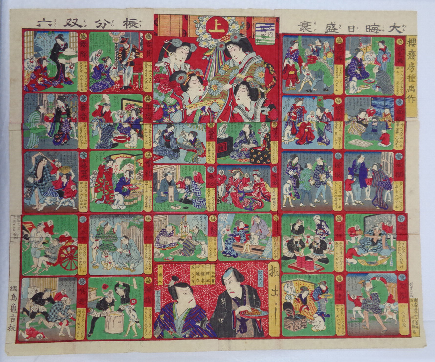 大晦日に行う事柄を盛・衰に分けて描いた双六。盛は歳暮や太物買、金拾などで、衰は疲弊や夫婦叱咤、地獄など。