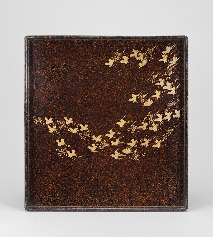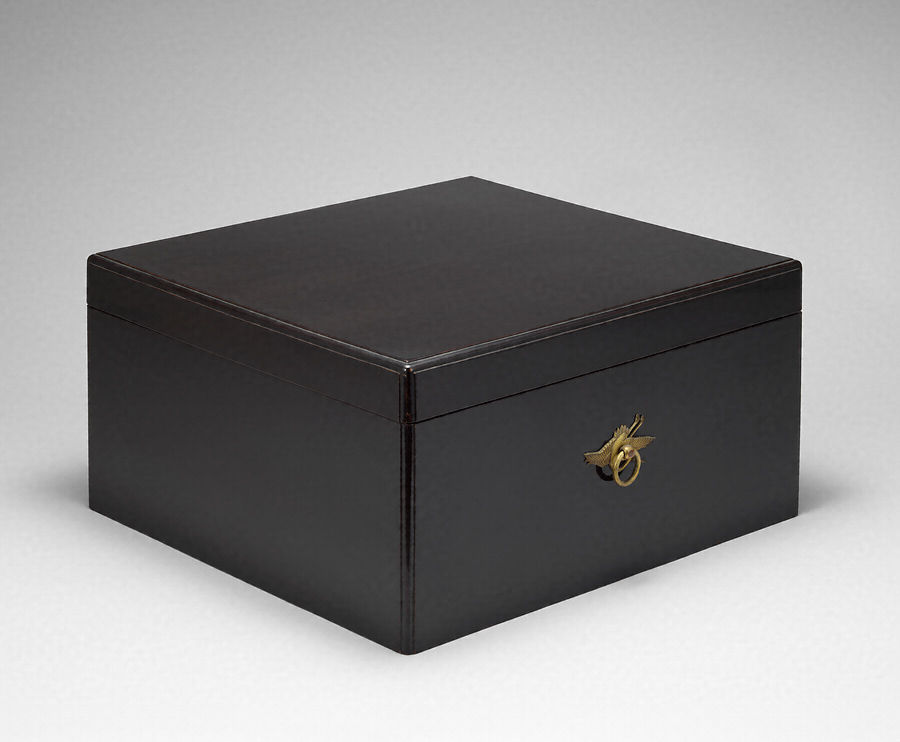 長方形、印籠蓋造、唐戸面取で、総体黒漆塗とし、見返しには淡梨子地に観世千鳥の平蒔絵がある。身の立ち上がりも淡梨子地で、身の内には萌黄地小葵模様の緞子裂が貼られる。鐶は金銅製で、座金は金銅製で鶴の容彫となり、紫平緒の掛紐が附属する。桐製の外箱の蓋甲には「太鼓 壱/木下政十郎/所蔵」との旧蔵者の墨書がある。