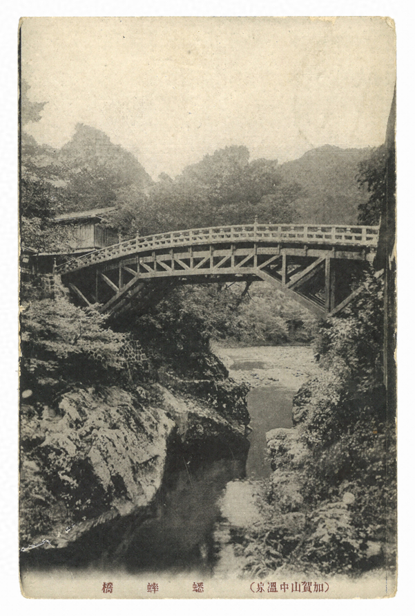 絵葉書「(加賀山中温泉)蟋蟀(こおろぎ)橋」を使用。切手は1銭5厘。