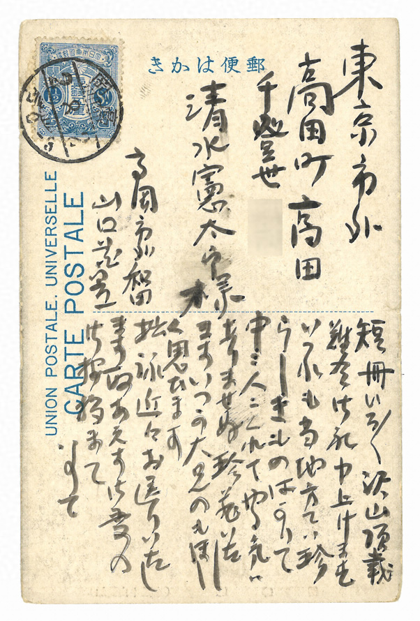 高岡市外和田 山口花笠→東京市外高田町高田千登世 清水憲太郎。内容は短冊の礼状。清水は不明。