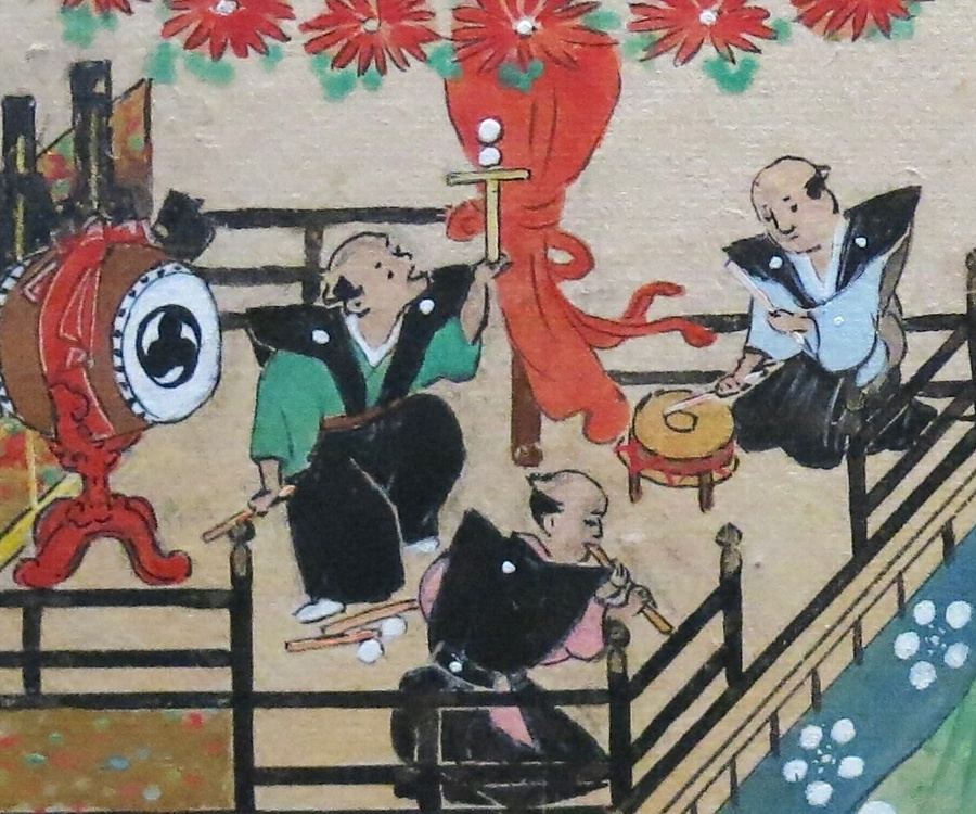 本図で最も注目すべきは、現在は無い8基目に四輪板車(※3)の曳山が描かれていることである。他の曳山同様に鋒留(ほこどめ)(薄(すすき)に三日月)、幔幕(萌黄地(もえぎじ)梅鉢紋)、曳手12名に鈴棒曳きまで描かれている。この台座手前には笛と締(しめ)太鼓を演奏する人物が、奥には長胴(宮)太鼓が描かれている。台座中央には撥(ばち)の上に小さな鞠を重ねる曲芸(立て物というバランス芸)をしている人物が描かれる。これは史料数点(※4)に見られる、坂下町の「大神楽山(だいかぐらやま)(太(だい)神楽山車(やま))」かと思われる。史料によると、坂下町の大神楽山車は1686(貞享3)年〔又は1678(延宝6)年〕に簡易な太鼓の地車(じぐるま(だんじり))(※3)が認可され、1718(享保3)年に他7基同様の指車(さしぐるま)(※2)の曳山が認可され、1776(安永5)年に山町の訴えにより、元の地車に戻すように(又は差し止め)された。よって本図の内容の年代は1718年から1776年の間とも考えられる(製作年代はそれより後)。ちなみに、坂下町が山町10ヶ町に入ったのは不明だが昭和14~5年頃以後とされ(※4)、また源太夫獅子で先導するようになったのは、国の文化財補助事業により射水神社の獅子頭が復刻された、昭和58年(1983)である(※5)。