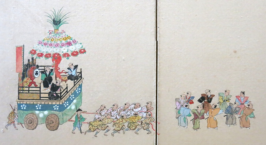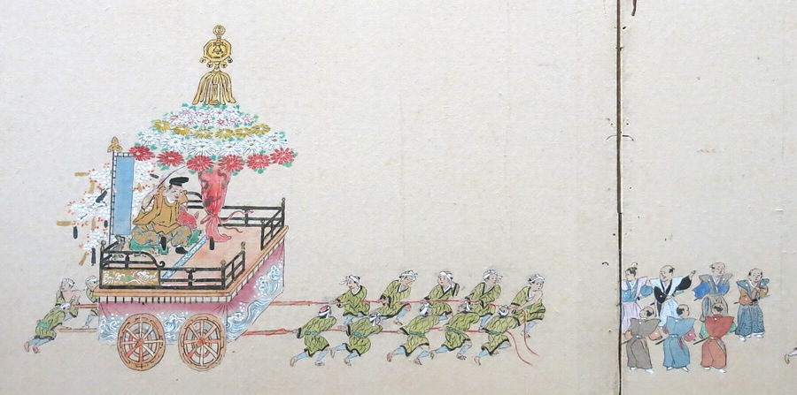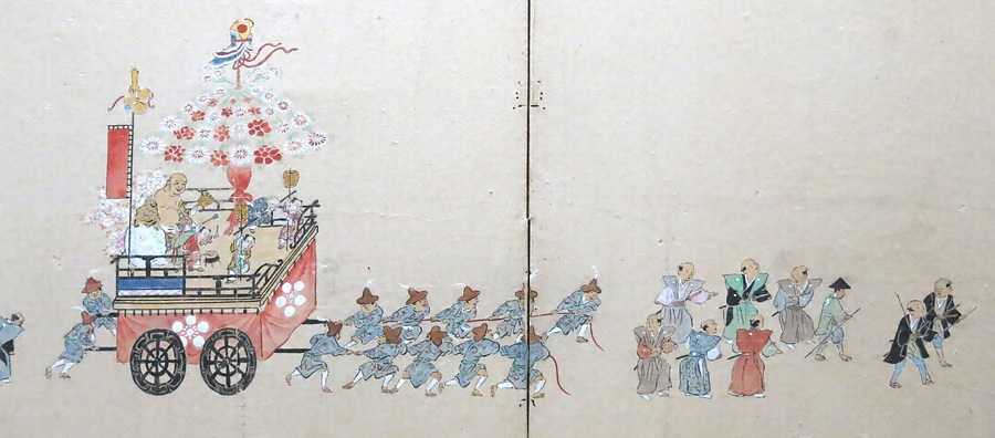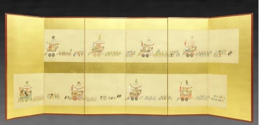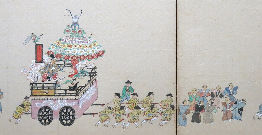 しほんちゃくしょくたかおかみくるまやまさいれいぎょうれつえまきびょうぶ