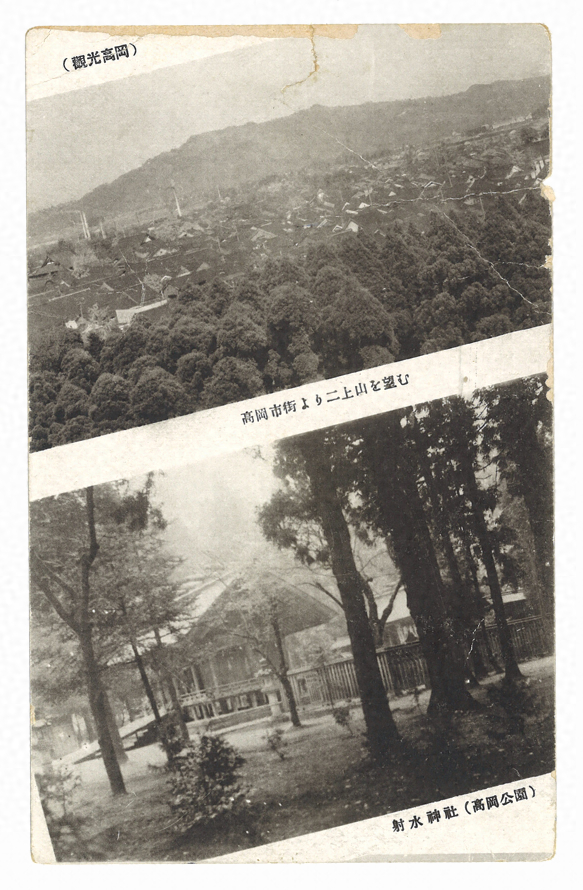 えはがき「かんこうたかおか(たかおかしがいよりふたがみさんをのぞむ/いみずじんじゃ(たかおかこうえん))」