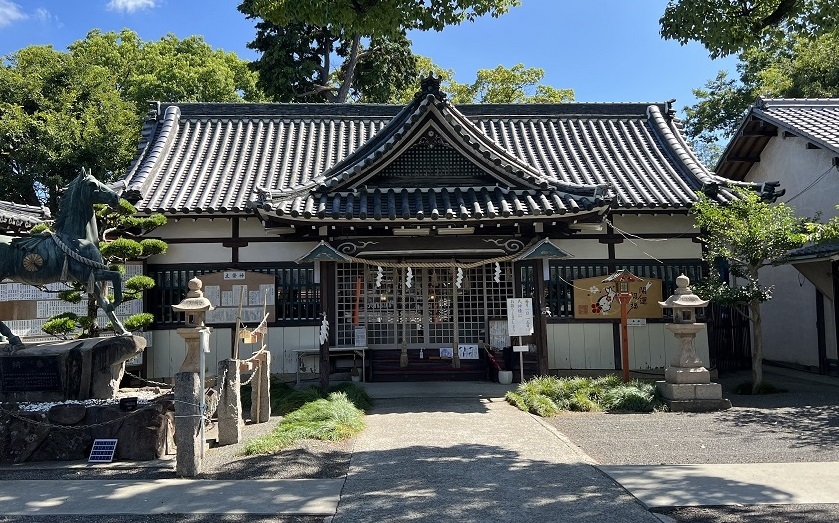 境内中央に南面して建つ入母屋造平入本瓦葺の拝殿。南に入母屋造妻入向拝を付し、北に両下造幣殿を接続する。拝殿正面は向拝両脇に格子窓を開け、楣と桁間の小壁に舟肘木と長押を装飾的に貼付ける。内部は一室で格天井張。重厚な本瓦葺屋根が境内景観を形成。