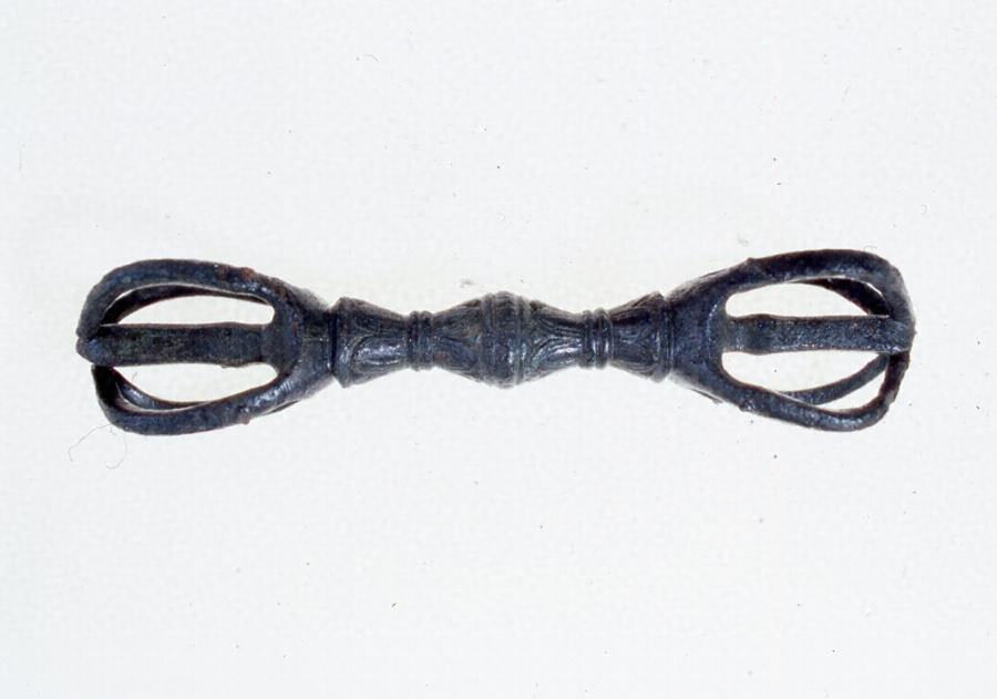 全長14.6㎝、両鈷(りょうこ)部の長さ4.5㎝、蓮(れん)弁帯(べんたい)の長さ5.6㎝、中心径1.7㎝、重さ160gである。