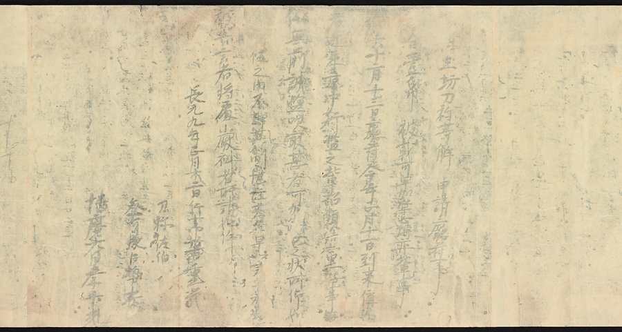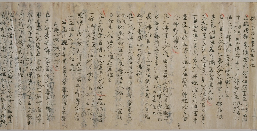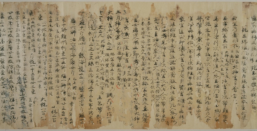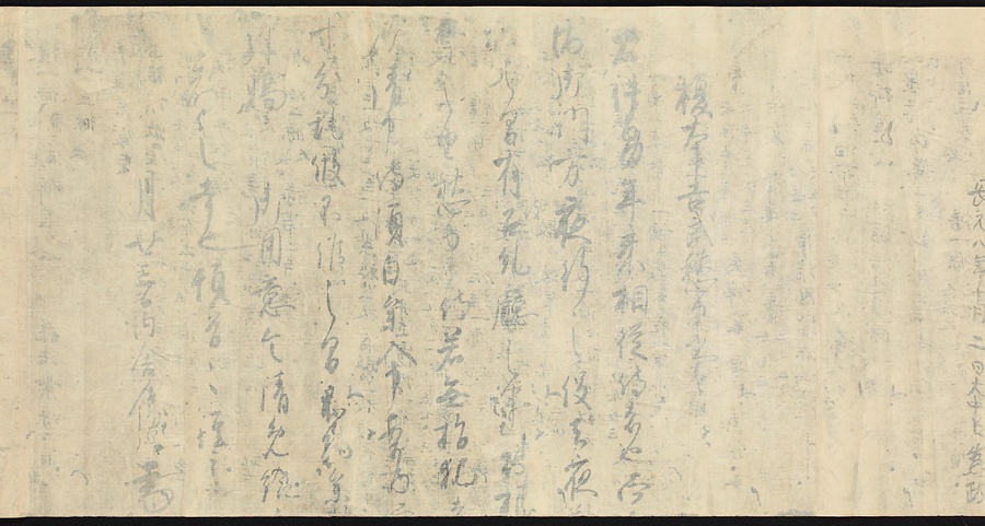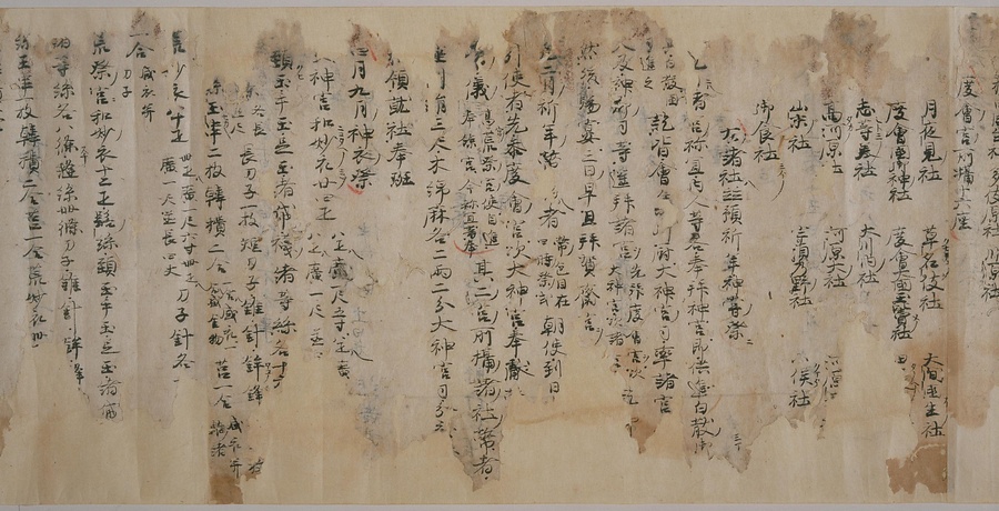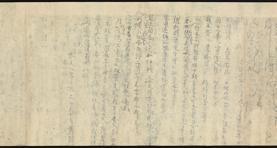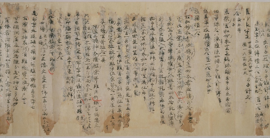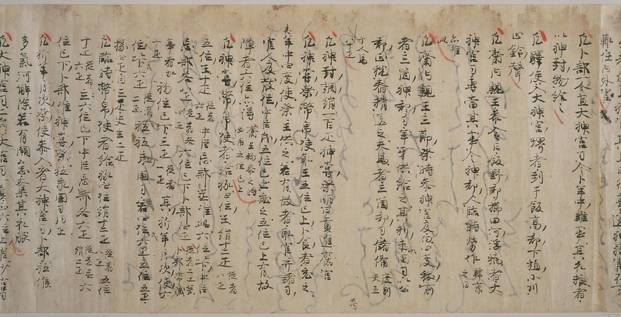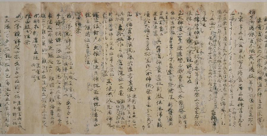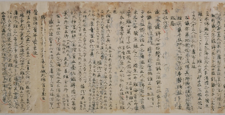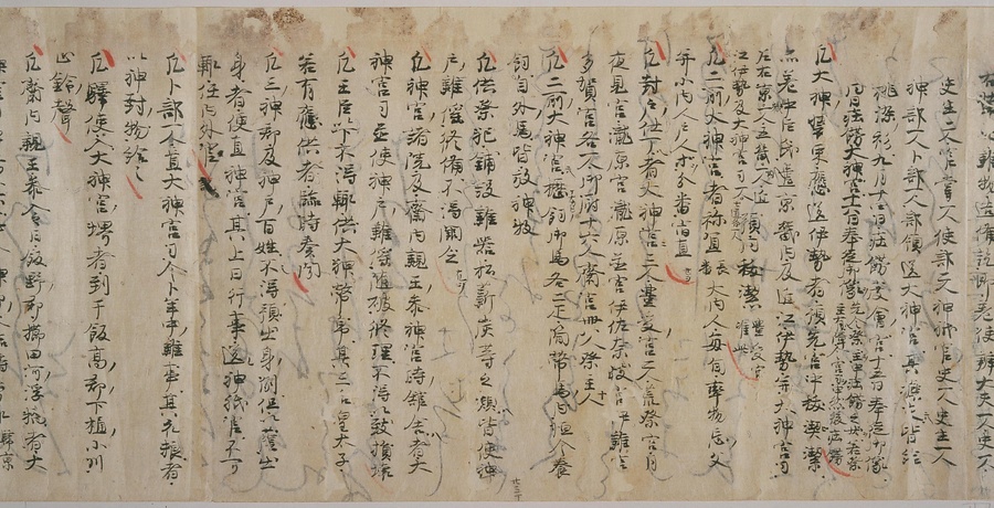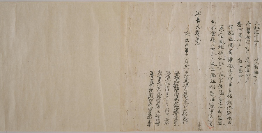 現存する最古の写本として知られるこの『延喜式』は、多くの文書を再利用して書き写されています。今回ご紹介する巻には仮名で記された手紙、仮名消息が確認できます。この仮名消息も、平安時代・11世紀のものと考えられ、自由でのびやかな筆使いに特徴があります。他にも、この仮名消息の前後には長元8年・9年といった年号のある文書が確認でき、当時の社会状況を知るうえでも貴重な史料ということができます。なお、この作品は、奈良・平安時代を通じて権勢を誇った藤原氏の一族である、九条家に伝えられていました。