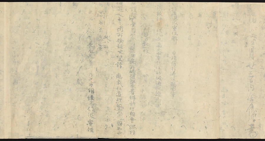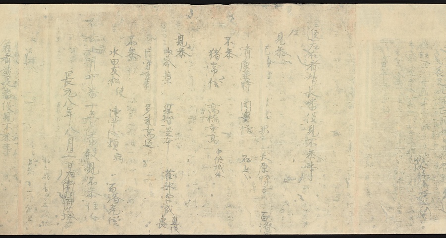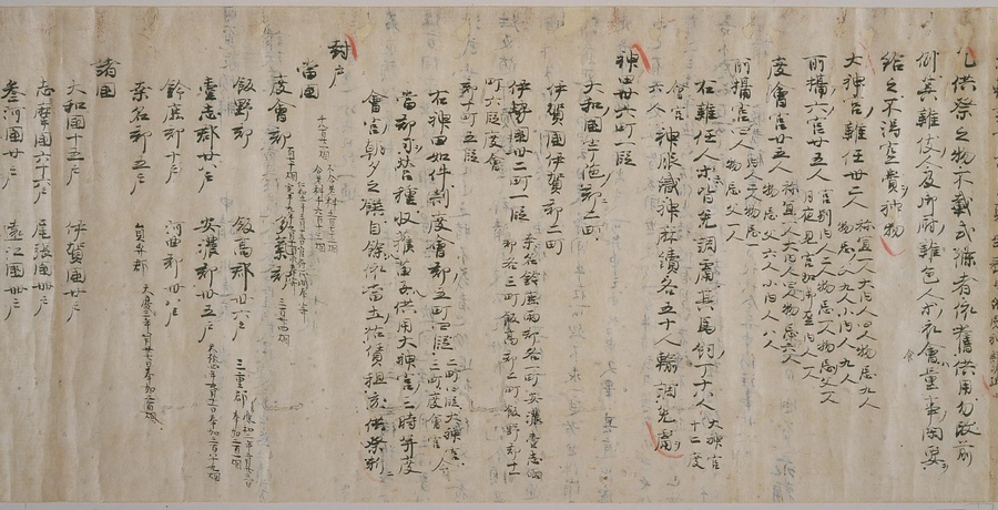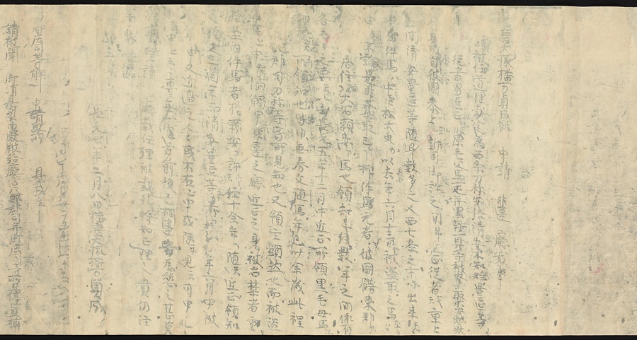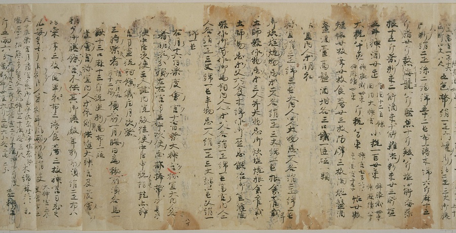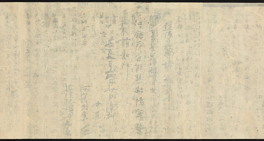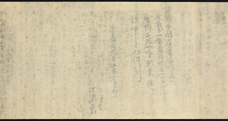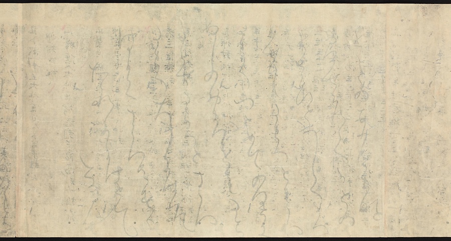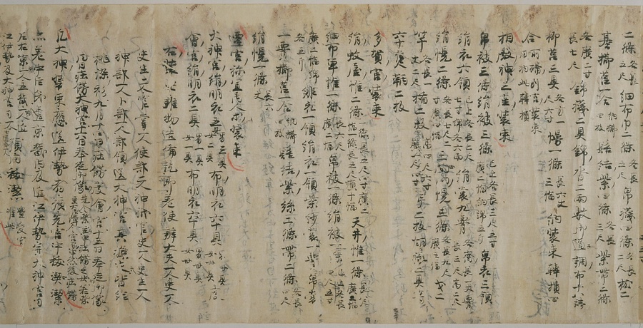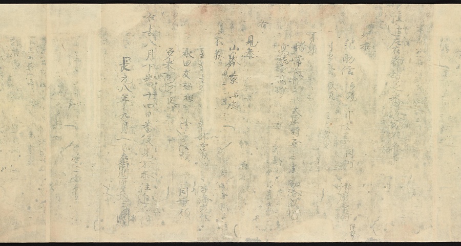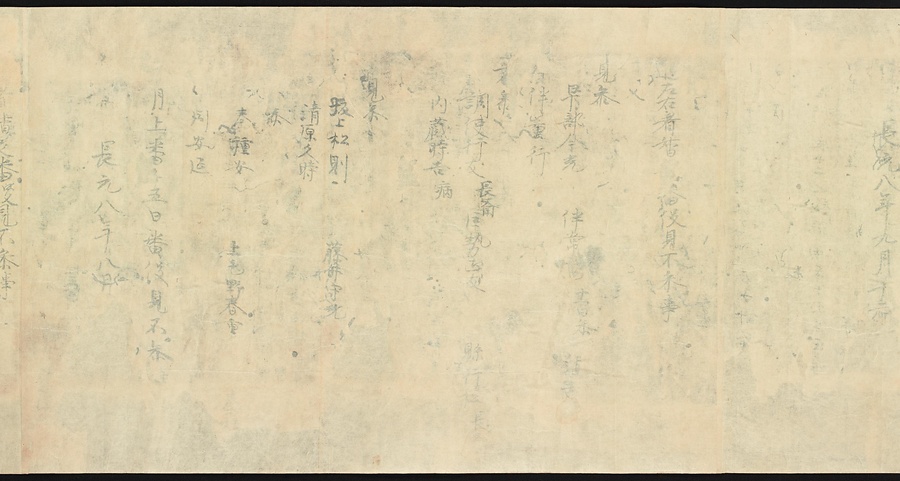現存する最古の写本として知られるこの『延喜式』は、多くの文書を再利用して書き写されています。今回ご紹介する巻には仮名で記された手紙、仮名消息が確認できます。この仮名消息も、平安時代・11世紀のものと考えられ、自由でのびやかな筆使いに特徴があります。他にも、この仮名消息の前後には長元8年・9年といった年号のある文書が確認でき、当時の社会状況を知るうえでも貴重な史料ということができます。なお、この作品は、奈良・平安時代を通じて権勢を誇った藤原氏の一族である、九条家に伝えられていました。