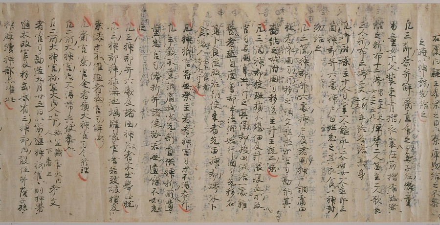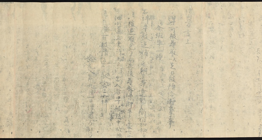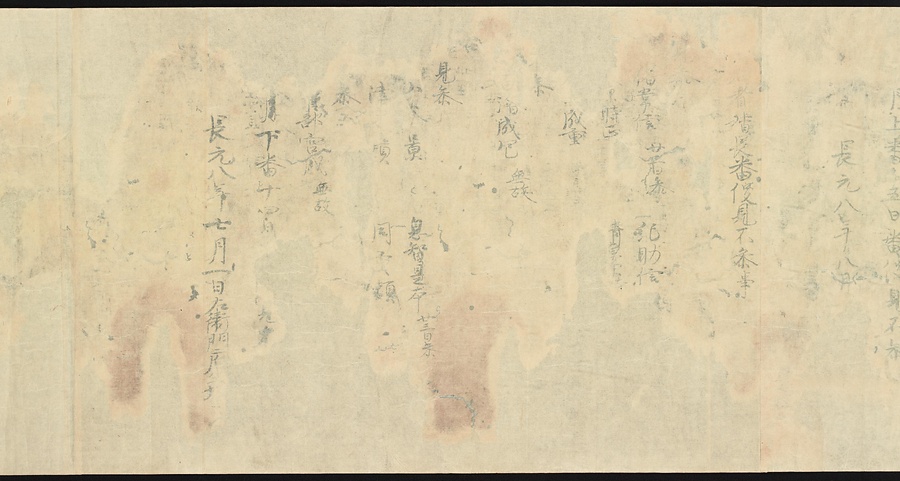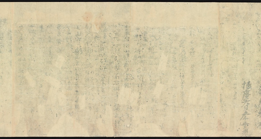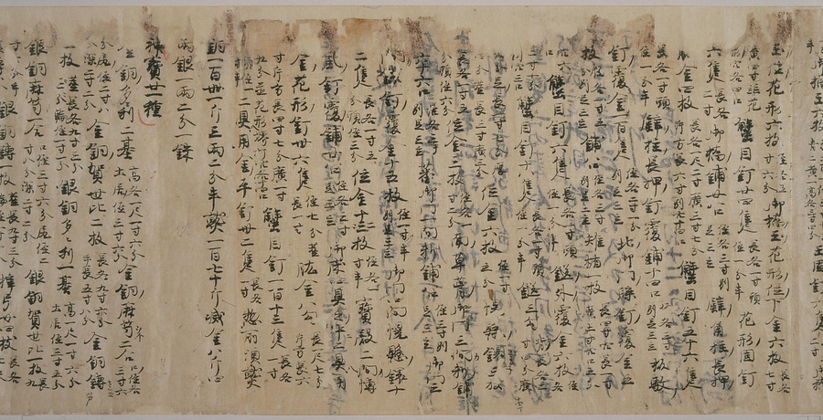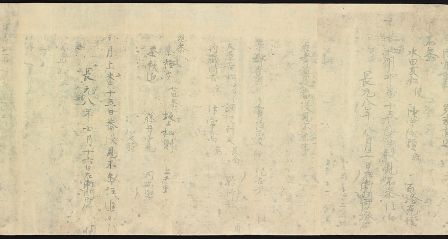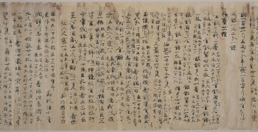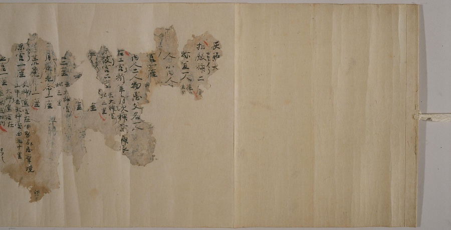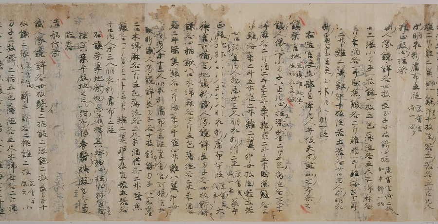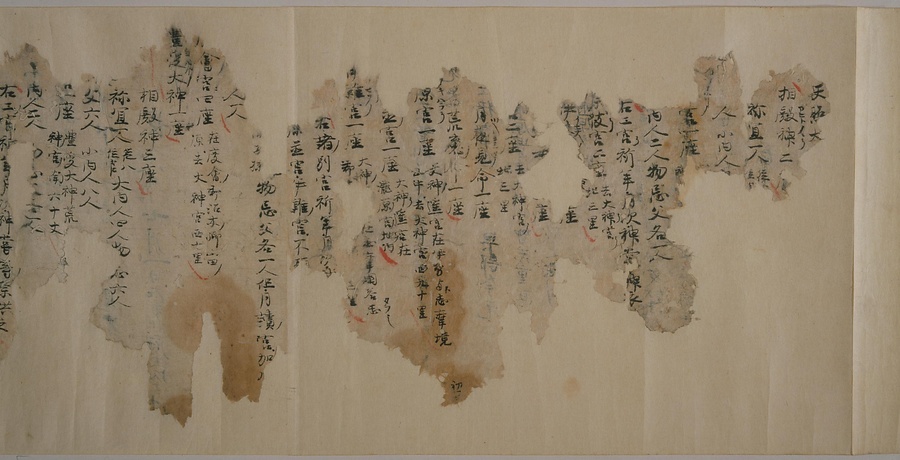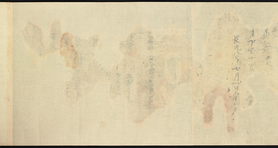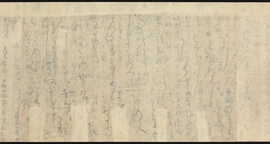 現存する最古の写本として知られるこの『延喜式』は、多くの文書を再利用して書き写されています。今回ご紹介する巻には仮名で記された手紙、仮名消息が確認できます。この仮名消息も、平安時代・11世紀のものと考えられ、自由でのびやかな筆使いに特徴があります。他にも、この仮名消息の前後には長元8年・9年といった年号のある文書が確認でき、当時の社会状況を知るうえでも貴重な史料ということができます。なお、この作品は、奈良・平安時代を通じて権勢を誇った藤原氏の一族である、九条家に伝えられていました。