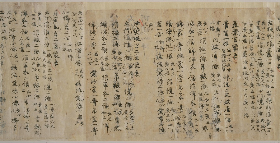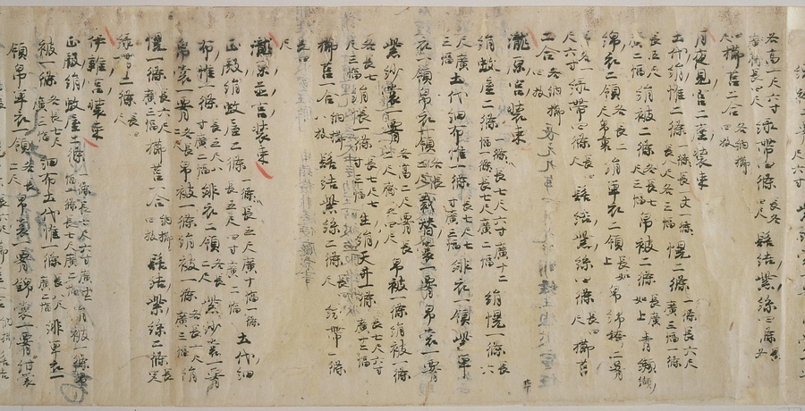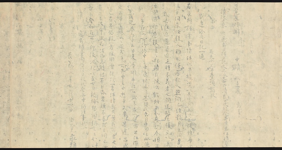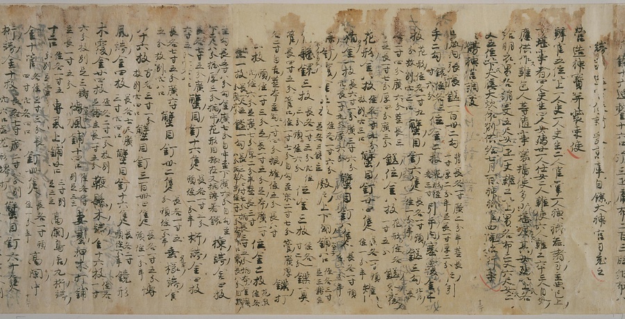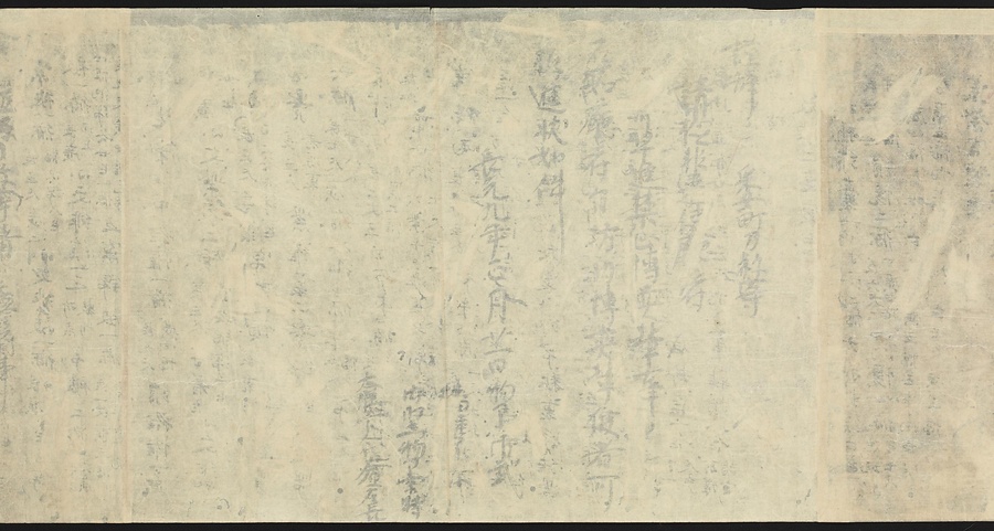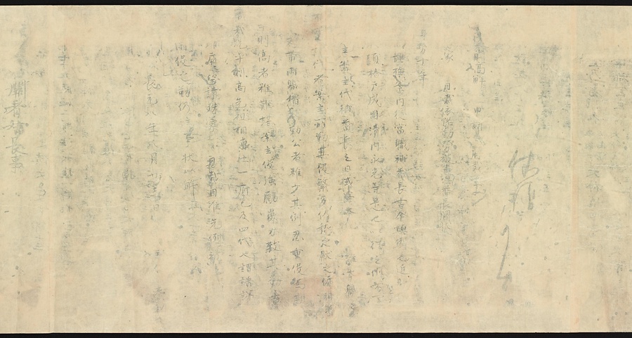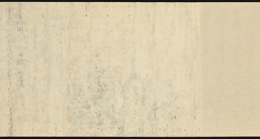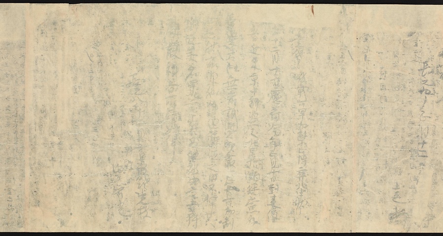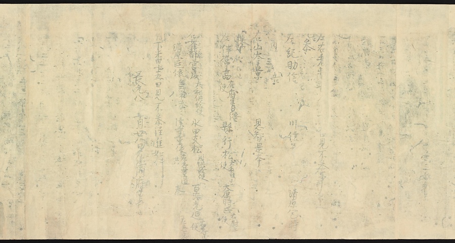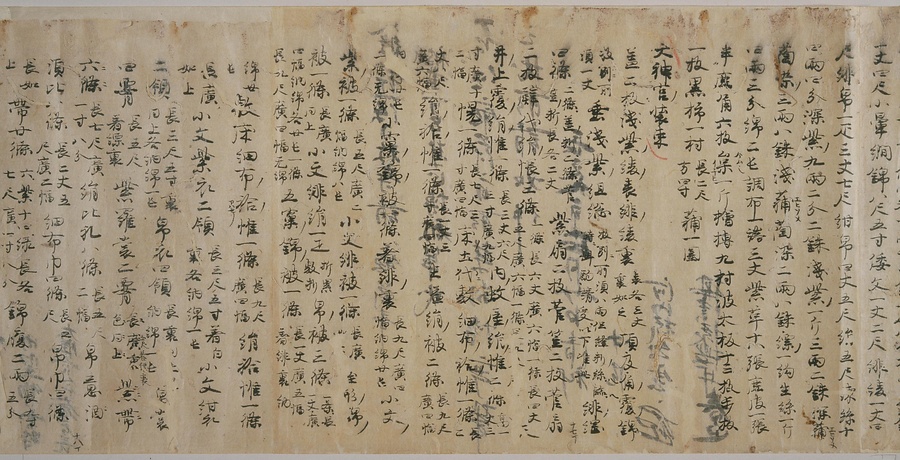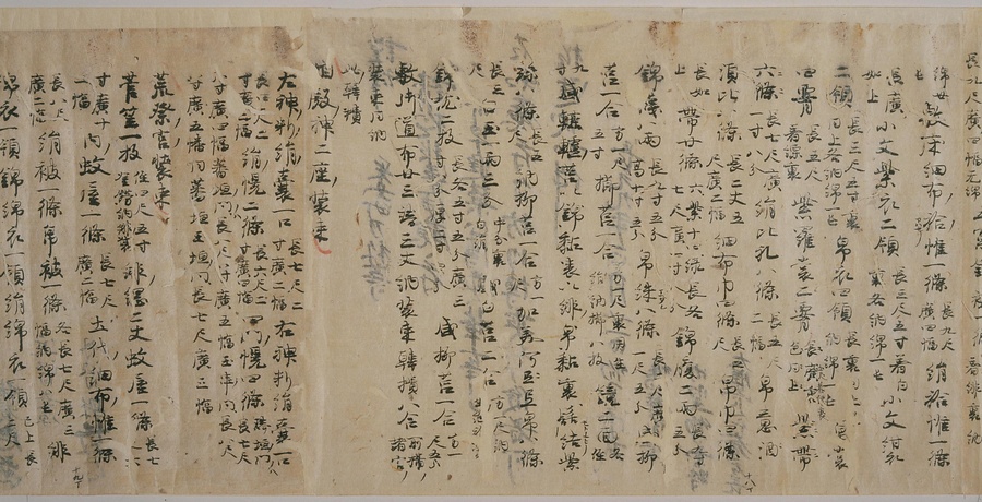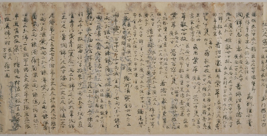 現存する最古の写本として知られるこの『延喜式』は、多くの文書を再利用して書き写されています。今回ご紹介する巻には仮名で記された手紙、仮名消息が確認できます。この仮名消息も、平安時代・11世紀のものと考えられ、自由でのびやかな筆使いに特徴があります。他にも、この仮名消息の前後には長元8年・9年といった年号のある文書が確認でき、当時の社会状況を知るうえでも貴重な史料ということができます。なお、この作品は、奈良・平安時代を通じて権勢を誇った藤原氏の一族である、九条家に伝えられていました。